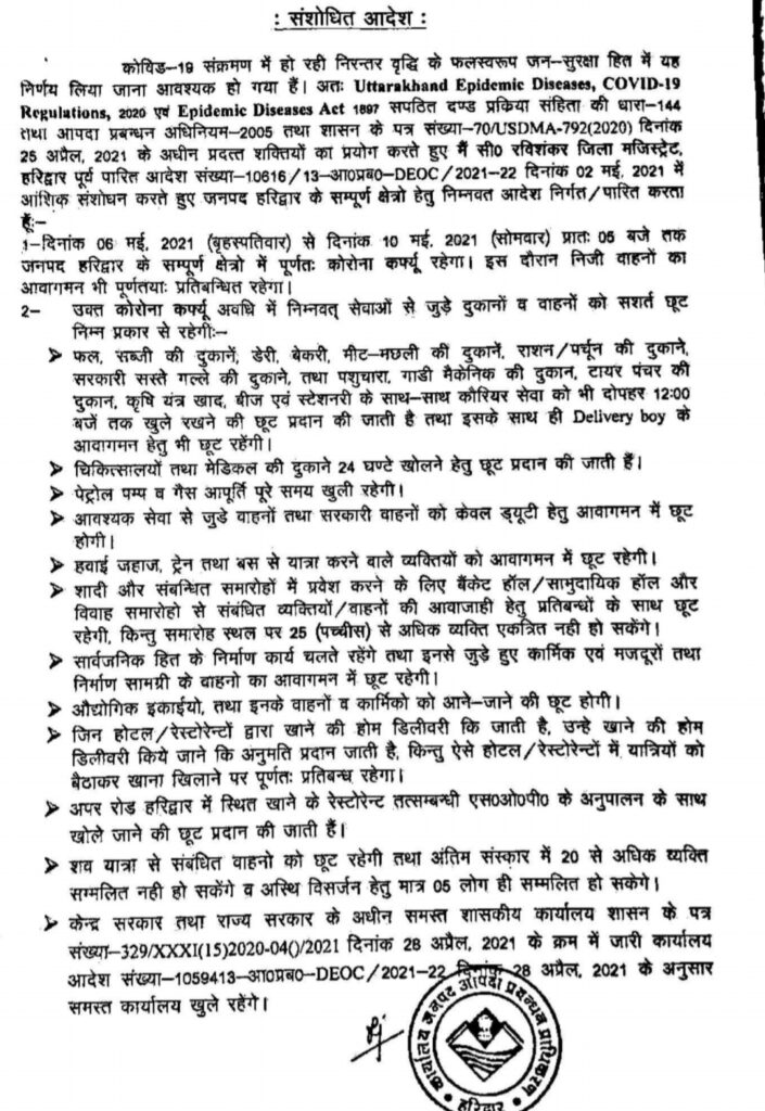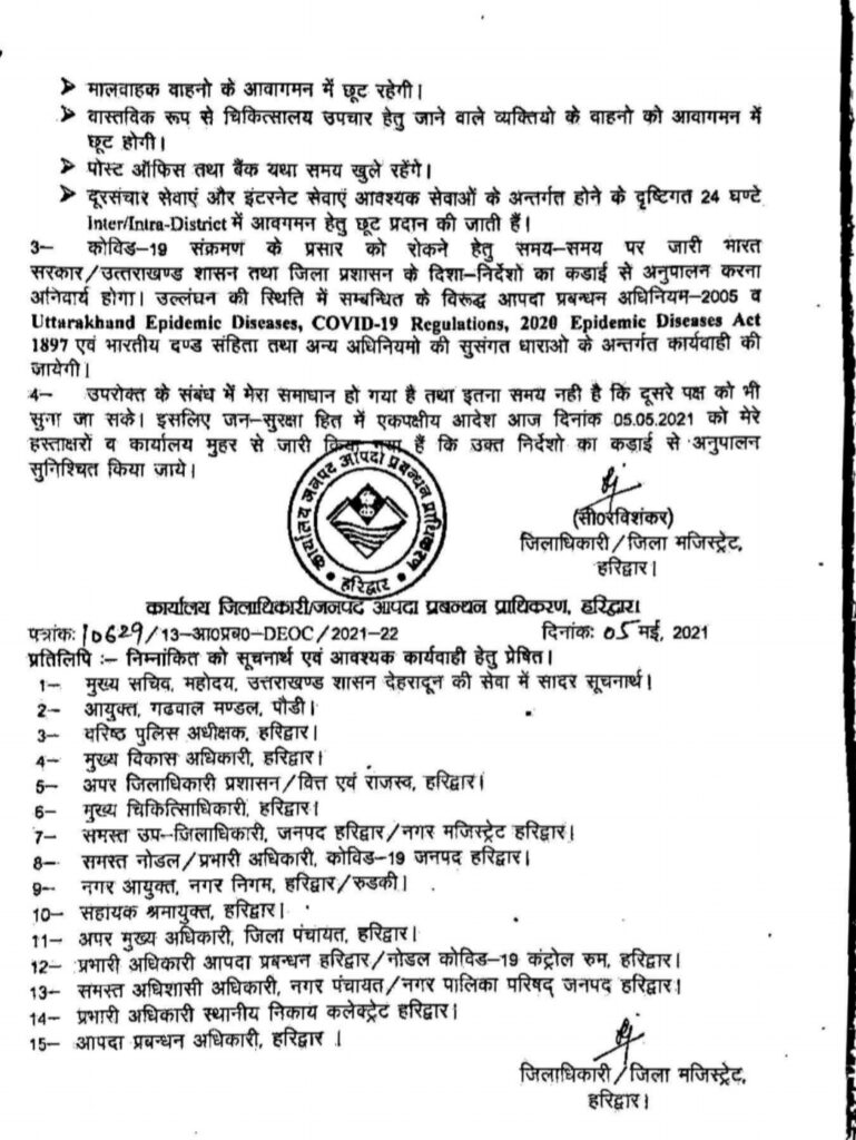 हरिद्वार – जिलाधिकारी सी0 रविशंकर ने जनपद में कोरोना कर्फ्यू 6 मई से बढ़ा कर 10 मई सुबह 5 बजे तक कर दिया गया सुबह 6 बजे तक बढ़ा था। इस दौरान एसेंसियल सर्विस से जुड़ी दुकानें दिन में 12 बजे तक ही खोलने की अनुमति है। अब स्टेशनरी, गाड़ी मैकेनिक, टायर पंचर की दुकानों को भी 12 बजे तक खोलने की अनुमति प्रदान की गई है।