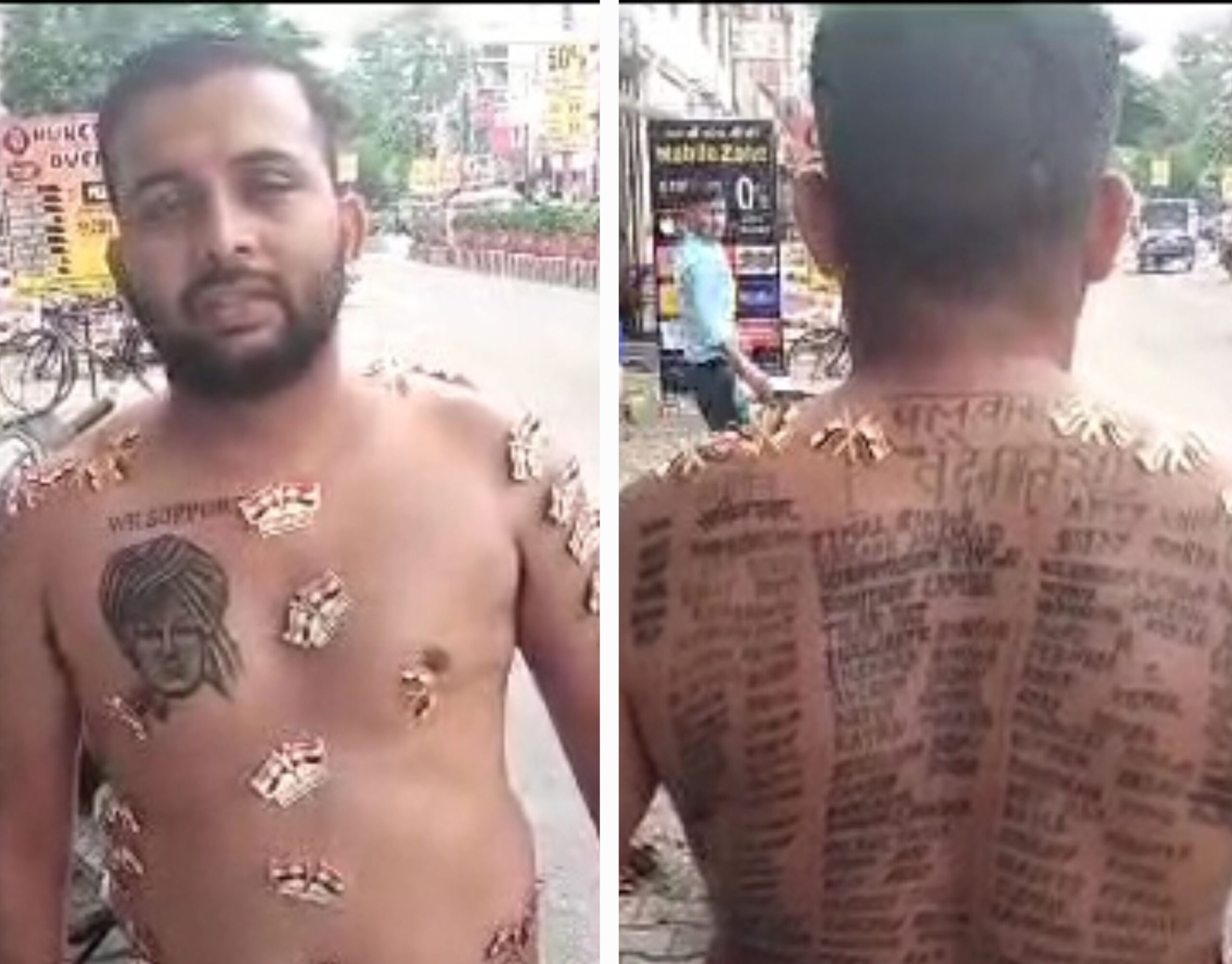 हरिद्वार – धर्मनगरी हरिद्वार में चल रहे कांवड़ मेले के दौरान तरह-तरह की कांवड़ देखने को मिल रही है। कोई मनोकामना पूरी करने के लिए कांवड़ उठा रहा है तो कोई मनोकामना पूरी होने के बाद। वहीं उत्तर प्रदेश के शामली से हरिद्वार पहुंचे एक कांवड़िए ने अपनी मनोकामना नहीं बल्कि देश के शहीदों के लिए कांवड़ उठाई है। कांवड़िए ने न केवल अपने शरीर पर 251 शहीदों के नाम गुदवाकर टैटू बनाए बल्कि 51 छोटे तिरंगे झंडे भी पिन से गोदकर शरीर पर चिपकाए है।