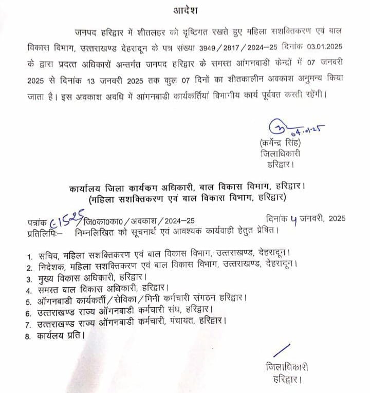 हरिद्वार – जिला मजिस्ट्रेट एवं जिलाधिकारी कर्मेन्द्र सिंह ने जनपद हरिद्वार में शीतलहर को दृष्टिगत रखते हुए महिला सशक्तिकरण एवं बाल विकास विभाग द्वारा प्रदत्त अधिकारों का उपयोग करते हुए जनपद हरिद्वार के समस्त आंगनबाडी केन्द्रों में 07 जनवरी 2025 से दिनांक 13 जनवरी 2025 तक कुल 07 दिनों का शीतकालीन अवकाश अनुमन्य किया है। इस अवकाश अवधि में आंगनबाडी कार्यकर्तियां विभागीय कार्य पूर्ववत करती रहेंगी।