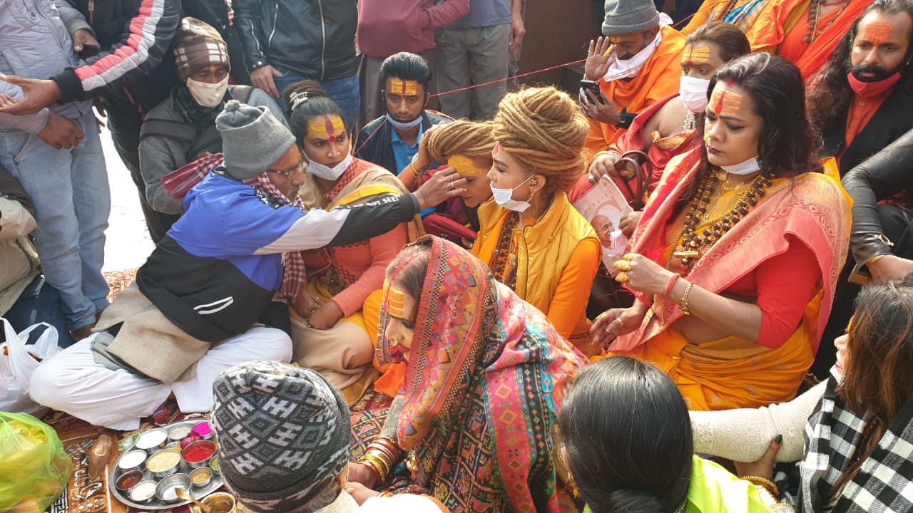 हरिद्वार – 2021 महाकुंभ मेला शुरू होने में थोड़ा ही समय शेष रह गया है। सभी तेरह अखाड़ो के साथ ही किन्नर अखाड़े के साधु संत हरिद्वार आना शुरू हो गए है। गुरुवार को किन्नर अखाड़े से जुड़े संतो ने हर की पौड़ी पर गँगा पूजन किया। किन्नर अखाड़े के आचार्य महामंडलेश्वर लक्ष्मी नारायण त्रिपाठी अपने अन्य किन्नरों संतो के साथ कल देर शाम हरिद्वार पहुंच गए थे, शाम को ही उन्होंने जूना अखाड़ा पहुंचकर अखाड़ा परिषद के महामंत्री हरि गिरि महाराज से मुलाकात कर कुम्भ मेले पर चर्चा की थी।