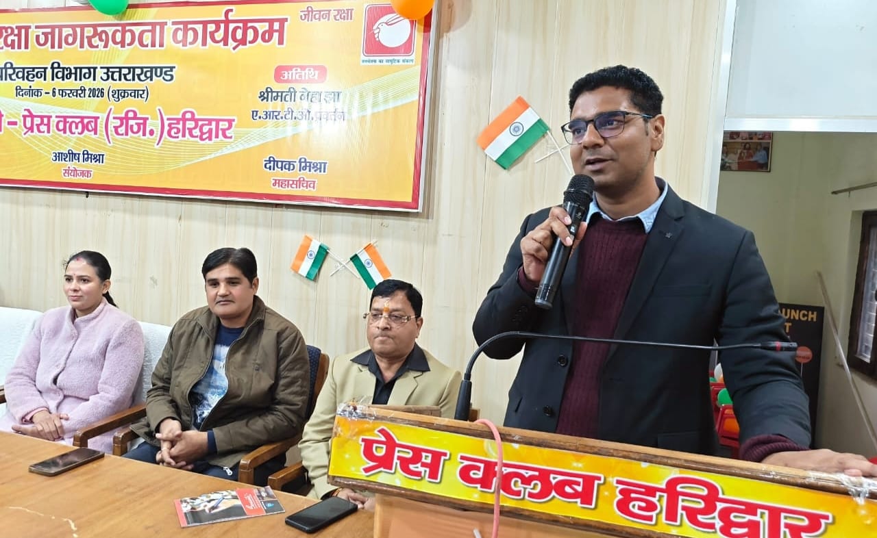 हरिद्वार, 6 फरवरी – सड़क दुर्घटनाओं पर प्रभावी अंकुश लगाने और आमजन को यातायात नियमों के प्रति जागरूक करने के उद्देश्य से सड़क सुरक्षा जागरूकता कार्यक्रम के तहत परिवहन विभाग हरिद्वार द्वारा प्रेस क्लब में संगोष्ठी का आयोजन किया गया। कार्यक्रम में परिवहन विभाग के अधिकारी, प्रेस क्लब पदाधिकारी एवं पत्रकार मौजूद रहे। मुख्य अतिथि एआरटीओ प्रशासन निखिल शर्मा तथा विशिष्ट अतिथि एआरटीओ प्रवर्तन नेहा झा ने यातायात नियमों की जानकारी देते हुए दुघर्टनाओं से बचाव के लिए वाहन चलाते समय नियमों का पालन करने, सीट बेल्ट लगाने और दोपहिया वाहन चलाने के दौरान हेलमेट अवश्य लगाने की अपील की और सभागार में मौजूद सभी पत्रकारों को यातायात नियमों का पालन करने की शपथ भी दिलायी।