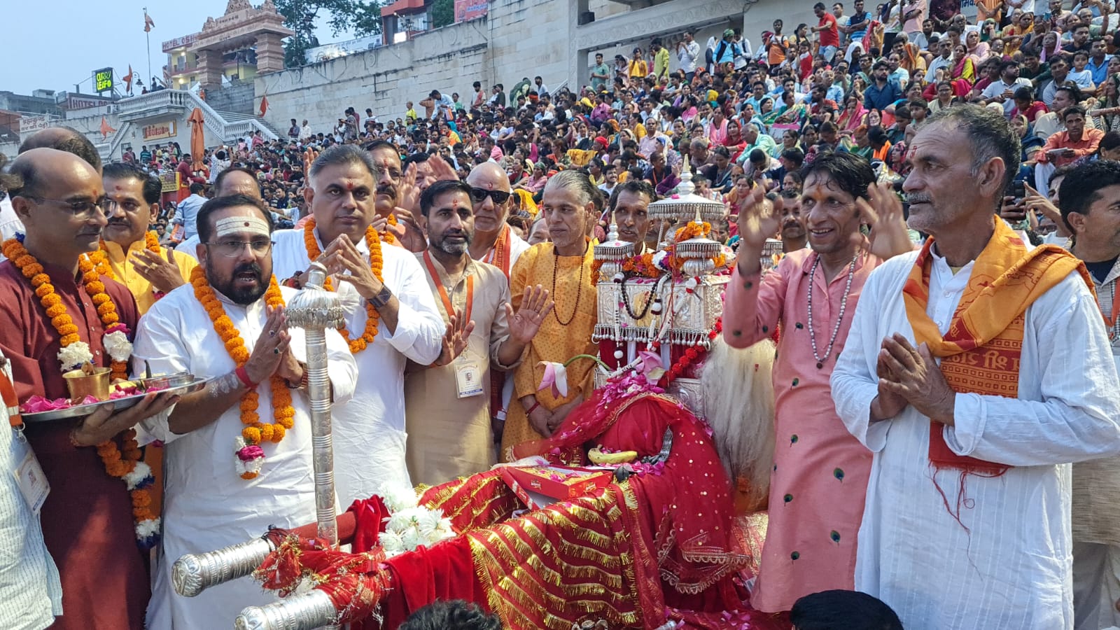 श्री गंगा सभा अध्यक्ष नितिन गौतम ने डोली की पूजा की। इस दौरान वहां सैकड़ों लोग मौजूद रहे।