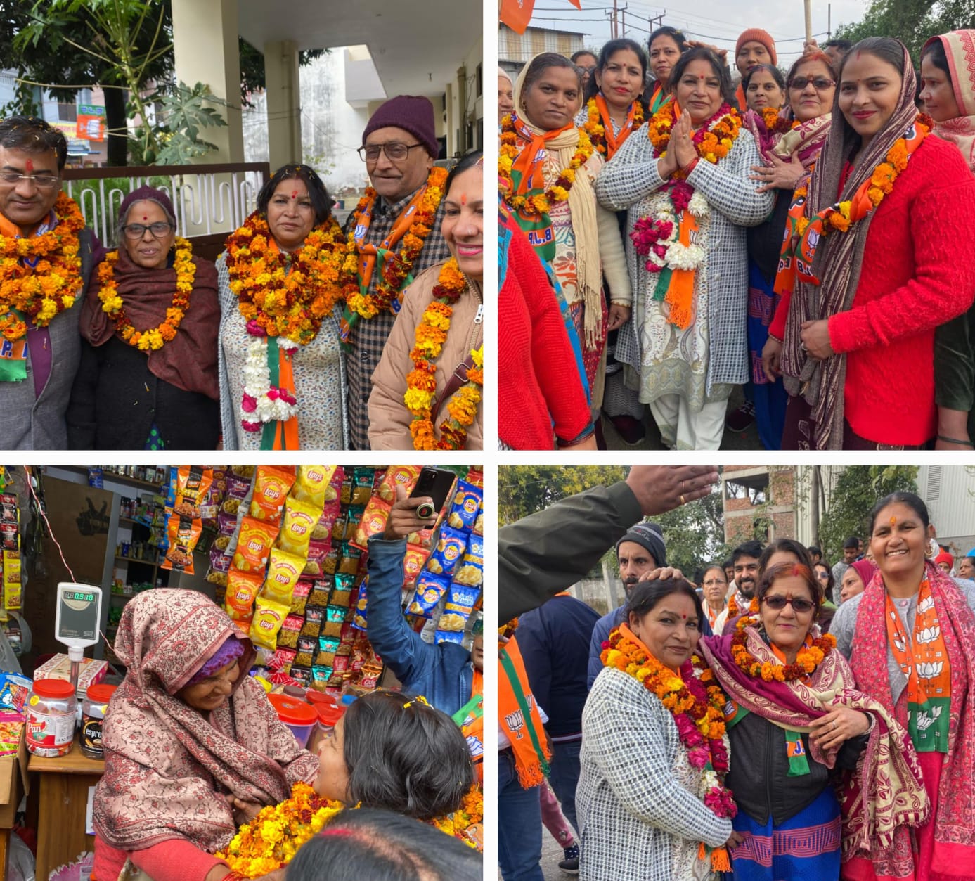 हरिद्वार – भारतीय जनता पार्टी की मेयर प्रत्याशी किरण जैसलमेर वार्ड नंबर 30 वार्ड नंबर 22 वार्ड नंबर 33 वार्ड नंबर 32 में जनसंपर्क किया और वार्डों के भाजपा प्रत्याशी सचिन अग्रवाल, राजेश शर्मा, राजेंद्र कटारिया, सपना शर्मा और अनुज सिंह के लिए वोट मांगे। इस अवसर पर किरण जैसल ने कहा कि आज समाज के सभी वर्गों का आशीर्वाद मुझे मिल रहा है, इतनी बरसात और भीषण सर्दी के बावजूद भी प्रत्येक वार्ड की देव तुल्य जनता मुझे आशीर्वाद देने आ रही हैं यही मेरी पूंजी है, उन्होंने कहा कि हरिद्वार की जनता ने मन बना लिया है कि हरिद्वार नगर निगम में ट्रिपल इंजन की सरकार बनानी है और भाजपा का बोर्ड बनाना है।
