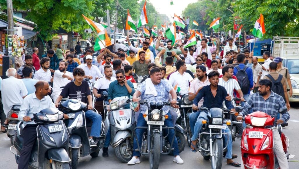 हरिद्वार – भारतीय जनता पार्टी युवा मोर्चा जिला हरिद्वार की ओर से आज तिरंगा यात्रा का आयोजन किया गया। कार्यक्रम में बीजेपी प्रदेश प्रभारी एवं राष्ट्रीय महामंत्री दुष्यंत कुमार गौतम, नगर विधायक मदन कौशिक, युवा प्रदेश अध्यक्ष शशांक रावत, जिलाध्यक्ष विक्रम भुल्लर ने शुभारंभ किया। तिरंगा यात्रा ज्वालापुर से होते हुए रानीपुर मोड़ पहुंची, इस तिरंगा यात्रा का उद्देश्य, नई पीढ़ी को राष्ट्रीय ध्वज और देश के लिए शहीद हुए लाखों बलिदानियों के बारे में जान सके। कार्यक्रम से पूर्व शहीद स्मारक में अमर शहीद जगदीश वत्स की प्रतिमा पर माल्यार्पण कर नमन किया गया।