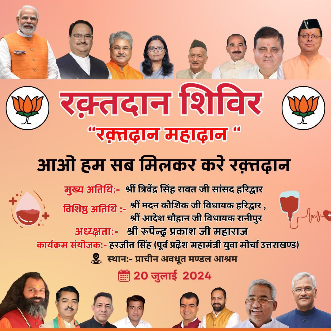 हरिद्वार – बीजेपी के पूर्व प्रदेश महामंत्री युवा मोर्चा हरजीत सिंह द्वारा आगामी 20 जुलाई को प्राचीन अवधूत मंडल आश्रम में रक्तदान शिविर का आयोजन किया जा रहा है। शिविर का उद्देश्य आम लोगों में रक्तदान के प्रति जागरूकता लाना है।