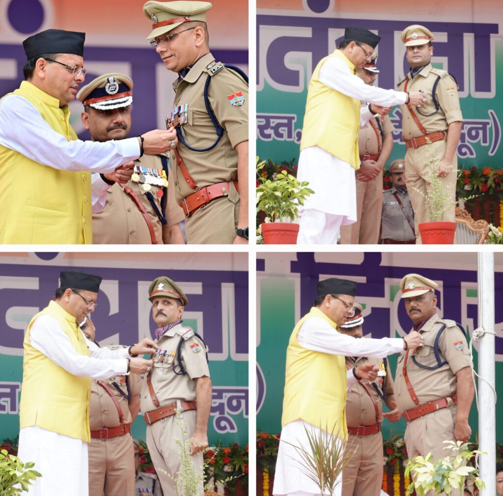 मुख्यमंत्री ने इस अवसर पर मुख्यमंत्री सराहनीय सेवा पदक से अपर पुलिस अधीक्षक, एस०डी०आर०एफ० विजेन्द्र दत्त डोभाल एवं दलनायक आईआरबी द्वितीय प्रताप सिंह तोमर को सम्मानित किया। सेनानायक, एस०डी०आर०एफ० उत्तराखण्ड श्री मणिकान्त मिश्रा और पुलिस अधीक्षक, जनपद उत्तरकाशी श्री अर्पण यदुवंशी को मुख्यमंत्री ने विशिष्टि कार्य के लिए सराहनीय सेवा पदक से सम्मानित किया। वर्ष 2023 में पांचवी एशियन यूथ एथलेटिक्स, ताशकंद, उजबेकिस्तान में आयोजित अन्तरराष्ट्रीय एथलेटिक्स चैंपियनशिप में स्वर्ण पदक अर्जित करने वाले प्रियांशु, रजत पदक प्राप्त करने वाले राहुल सरनालिया एवं एथलेटिक्स प्रशिक्षक लोकेश कुमार को भी मुख्यमंत्री द्वारा सम्मानित किया गया।