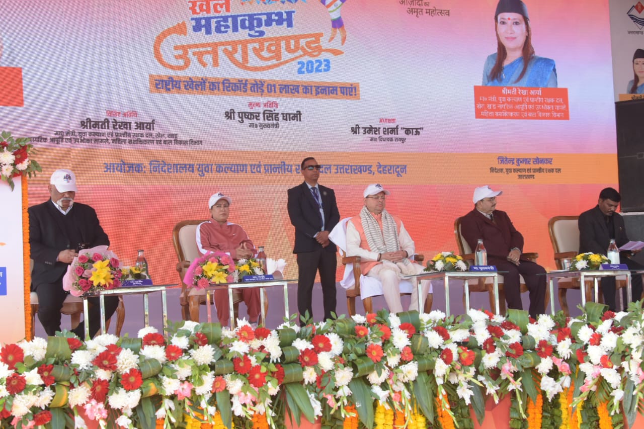 देहरादून – देहरादून स्थित महाराणा प्रताप स्पोर्ट्स कॉलेज में सूबे के मुख्यमंत्री पुष्कर सिंह धामी और खेल एवं युवा कल्याण मंत्री रेखा आर्या ने राज्यस्तरीय खेल महाकुंभ-2023 का विधिवत शुभारंभ किया। राज्य स्तरीय खेल महाकुंभ में 13 जनपदों की 13 टीमें प्रतिभाग कर रही हैं। जहां खिलाडिय़ों ने शानदार मार्च पास्ट किया। साथ ही इस दौरान दौरान सांस्कृतिक प्रस्तुतियाँ प्रस्तुत की गईं। वही राज्यस्तरीय खेल महाकुंभ में खिलाडियों ने विभिन्न खेलों में शानदार प्रदर्शन किया, सीएम धामी और खेल मंत्री ने सभी विजेता खिलाड़ियों को प्रसस्ति पत्र और मेडल पुरुस्कार से सम्मानित किया और उन्हें भविष्य के लिए शुभकामनायें दी।