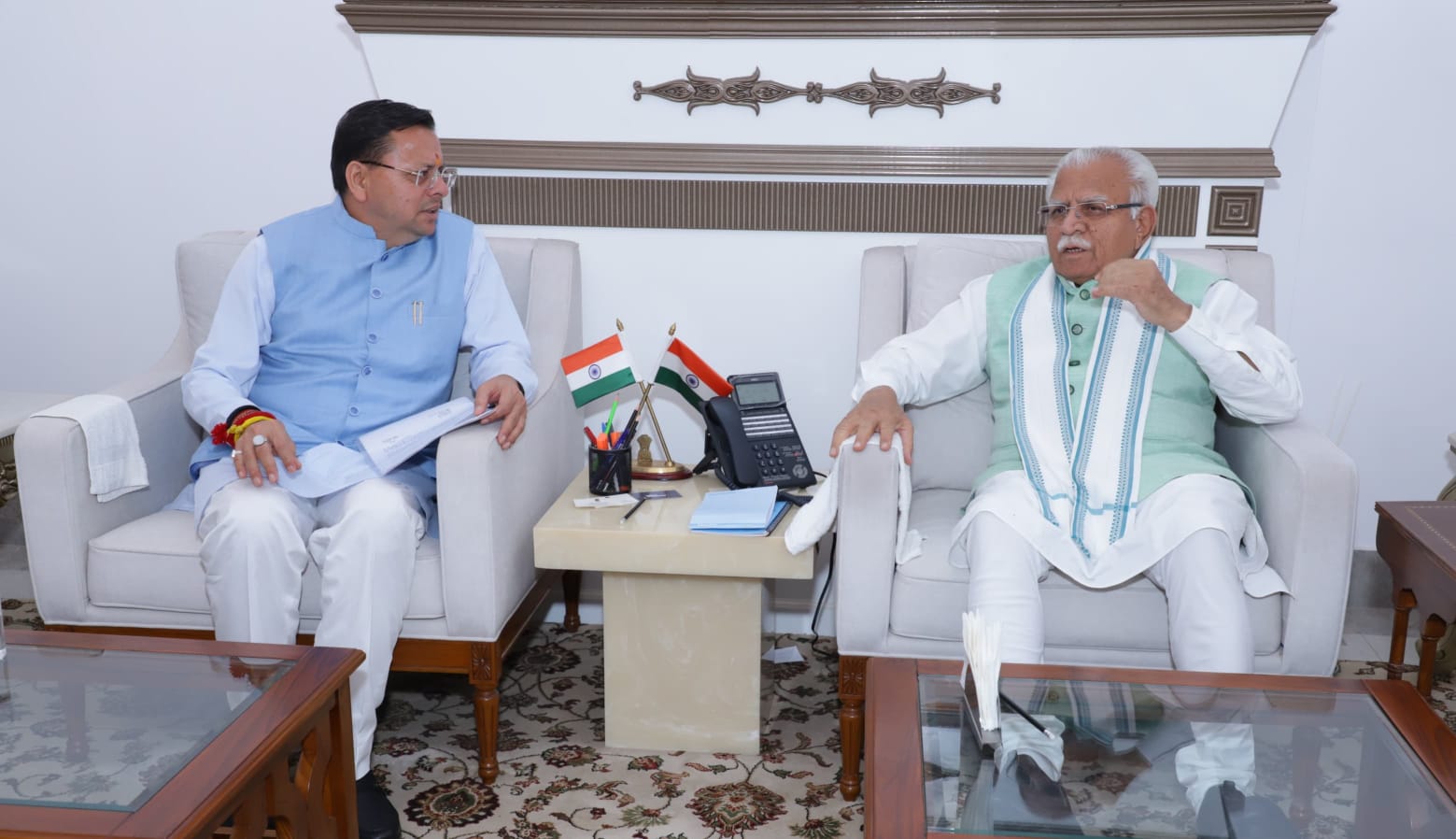 देहरादून – मुख्यमंत्री पुष्कर सिंह धामी ने शनिवार को नई दिल्ली में केंद्रीय ऊर्जा, आवास एवं शहरी कार्य मंत्री मनोहर लाल खट्टर से भेंट कर राज्य से संबंधित विभिन्न विषयों पर चर्चा की। मुख्यमंत्री ने केंद्रीय मंत्री से हरिद्वार शहर में गंगा कॉरिडोर क्षेत्र से संबंधित लगभग ₹325 करोड़ की परियोजना के लिए धनराशि स्वीकृति का अनुरोध किया। मुख्यमंत्री ने आगामी कुंभ-2027 के दृष्टिगत इस परियोजना के अंतर्गत विद्युत लाइनों के भूमिगतकरण एवं प्रणाली के स्वचालन हेतु भी प्रथम चरण में ₹325 करोड़ की धनराशि शीघ्र स्वीकृत करने का अनुरोध किया, साथ ही द्वितीय चरण के अंतर्गत शेष लगभग ₹425 करोड़ की धनराशि भी अनुमोदित करने का अनुरोध किया। मुख्यमंत्री ने हरिद्वार एवं ऋषिकेश में आगामी कुंभ-2027 की तैयारियों के संदर्भ में हरिद्वार में घाटों के सौंदर्यीकरण, आवासीय सुविधाओं के सुदृढ़ीकरण एवं शहरी अवसंरचना के विकास हेतु केंद्र सरकार से आवश्यक सहयोग प्रदान किए जाने का अनुरोध किया। उन्होंने कहा कि इन कार्यों से राज्य में आने वाले श्रद्धालुओं एवं पर्यटकों को बेहतर सुविधाएं उपलब्ध कराई जा सकेंगी।