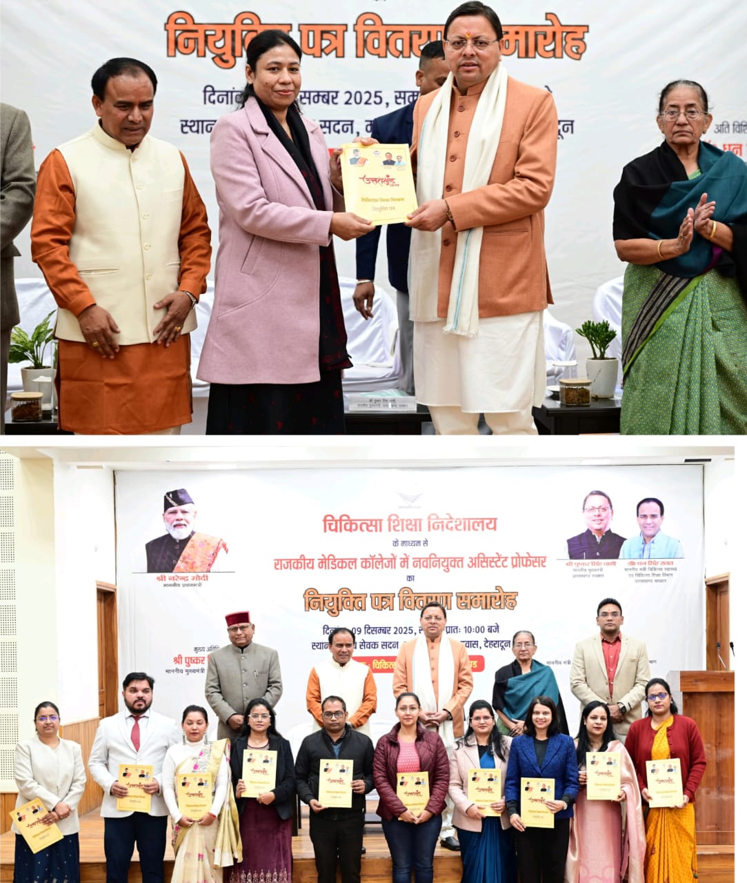 देहरादून – मुख्यमंत्री पुष्कर सिंह धामी ने मंगलवार को मुख्य सेवक सदन, मुख्यमंत्री आवास, देहरादून में आयोजित कार्यक्रम में प्रतिभाग करते हुए चिकित्सा सेवा चयन बोर्ड के माध्यम से चयनित राजकीय मेडिकल कॉलेजों में 142 असिस्टेंट प्रोफेसर्स को नियुक्ति पत्र वितरित किए। मुख्यमंत्री पुष्कर सिंह धामी ने नव नियुक्त असिस्टेंट प्रोफेसर्स को शुभकामनाएं देते हुए कहा कि ये अवसर चिकित्सा के क्षेत्र को सशक्त बनाने की दिशा में महत्वपूर्ण कदम सिद्ध होगा। मुख्यमंत्री ने सभी से आग्रह करते हुए कहा कि सभी अपने छात्रों को गुणवत्तापूर्ण शिक्षा और प्रशिक्षण प्रदान करने के साथ उनके भीतर संवेदनशीलता, सहानुभूति और सेवा की भावना भी विकसित करें। जिससे वे कुशल और दक्ष चिकित्सक बनने के साथ समाज के प्रति अपने कर्तव्यों और मानवता के प्रति अपने उत्तरदायित्व को भी पूरी ईमानदारी से निभाएं।