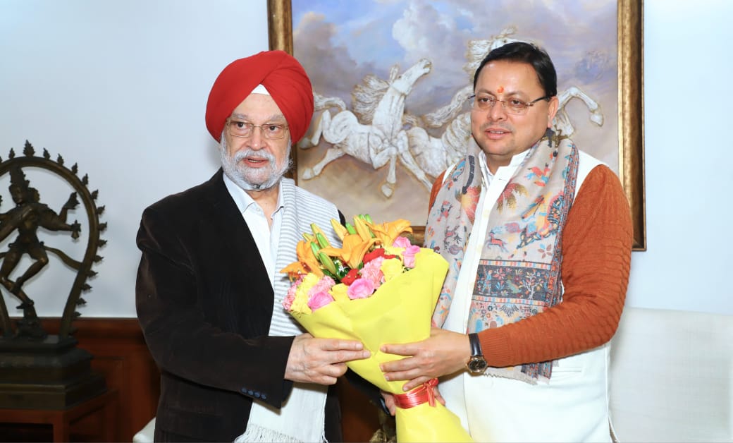 नई दिल्ली – मुख्यमंत्री पुष्कर सिंह धामी ने नई दिल्ली स्थित शास्त्री भवन में केंद्रीय पेट्रोलियम और प्राकृतिक गैस मंत्री हरदीप पुरी से शिष्टाचार भेंट की। मुख्यमंत्री ने केंद्रीय मंत्री को उत्तराखंड में होने जा रहे राष्ट्रीय खेलों के लिए आमंत्रित किया। उन्होंने मंत्रालय के तहत आने वाले ओएनजीसी और आईओसी से राष्ट्रीय खेलों में सीएसआर में स्पॉन्सरशिप दिए जाने का अनुरोध किया। केंद्रीय मंत्री ने राष्ट्रीय खेलों के आयोजन के लिए अपनी शुभकामनाएं देते हुए कहा कि मंत्रालय द्वारा हर संभव सहायता की जाएगी। साथ ही उन्होंने स्वास्थ्य और शिक्षा पर भी सीएसआर के लिए प्रोजेक्ट भेजने का सुझाव दिया। मुख्यमंत्री ने केंद्रीय मंत्री का धन्यवाद दिया।