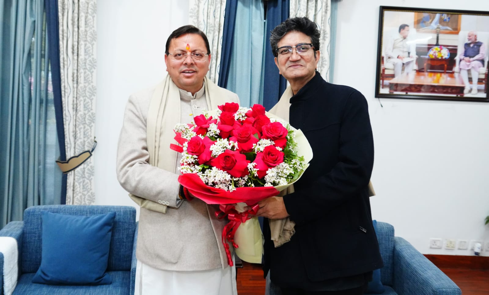 देहरादून – उत्तराखंड के मुख्यमंत्री पुष्कर सिंह धामी से आज मुख्यमंत्री आवास में केंद्रीय फिल्म प्रमाणन बोर्ड (सीबीएफसी) के अध्यक्ष, प्रख्यात लेखक, कवि एवं गीतकार प्रसून जोशी ने शिष्टाचार भेंट की।