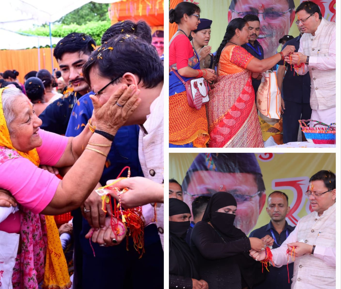 देहरादून – रक्षाबंधन समारोह के अवसर पर मुख्यमंत्री पुष्कर सिंह धामी ने सुमंगलम बैंकट हॉल बनबसा में मुख्यमंत्री सशक्त बहना उत्सव योजना के अंतर्गत कार्यक्रम में प्रतिभाग कर नारी शक्ति का अभिनंदन कर रक्षाबंधन के पावन पर्व की हार्दिक बधाई एवं शुभकामनाएं दी। इस अवसर पर नारी शक्ति द्वारा मुख्यमंत्री को तिलक लगाकर, रक्षा धागा बांधकर अभिनंदन एवं स्वागत किया। मुख्यमंत्री द्वारा विभिन्न क्षेत्रों में उत्कृष्ट कार्य करने वाली महिलाओं को भी सम्मानित किया।