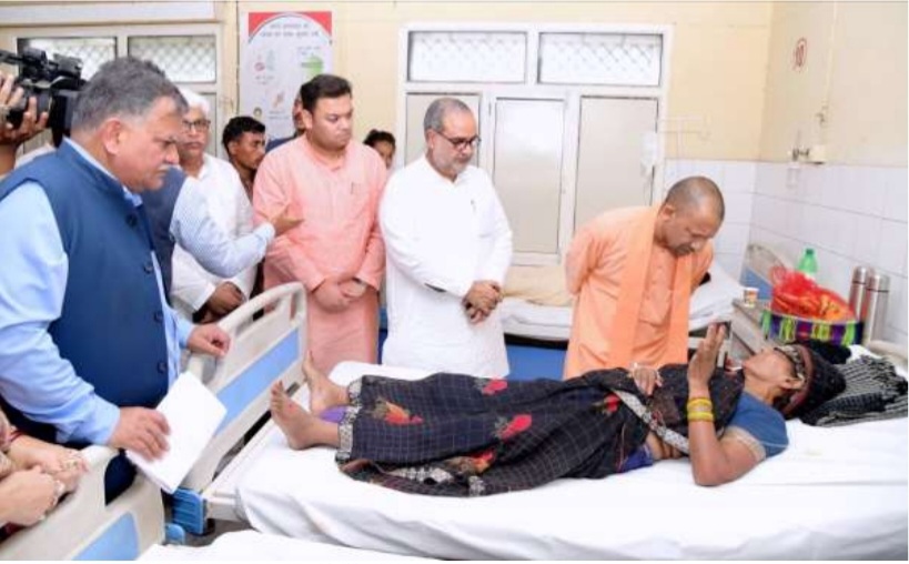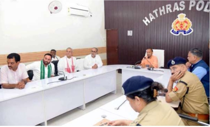 लखनऊ – उत्तर प्रदेश के मुख्यमंत्री योगी आदित्यनाथ ने आज जनपद हाथरस पहुंचकर विगत 02 जुलाई को सत्संग के दौरान मची भगदड़ में घायल व्यक्तियों का हालचाल जाना। मुख्यमंत्री ने जिलाधिकारी, मुख्य चिकित्साधिकारी तथा मुख्य चिकित्सा अधीक्षक को घायलों का समुचित उपचार करने के निर्देश देते हुए कहा कि दुर्घटना में घायल व्यक्तियों के इलाज में किसी प्रकार की कोई कमी नहीं रहनी चाहिए। मुख्यमंत्री जी ने तहसील सिकंदराराऊ के फुलरई मुगलगढ़ी स्थित घटना स्थल का निरीक्षण भी किया। उन्होंने रिजर्व पुलिस लाइन में अधिकारियों के साथ बैठक की। मुख्यमंत्री ने घटना स्थल पर तैनात रही महिला कांस्टेबल से बातचीत कर घटना के बारे में जानकारी प्राप्त की। इसके उपरान्त उन्होंने पुलिस लाइन में मीडिया प्रतिनिधियों को सम्बोधित भी किया।