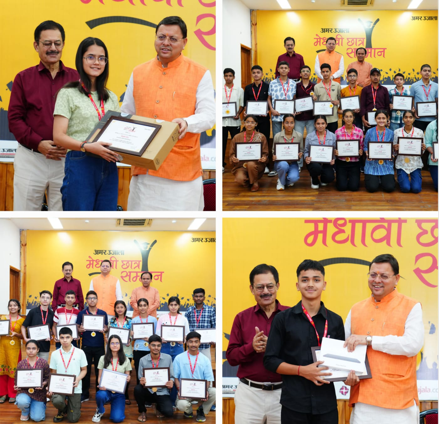 देहरादून – मुख्यमंत्री पुष्कर सिंह धामी ने मंगलवार को मुख्यमंत्री आवास स्थित मुख्य सेवक सदन में मेधावी छात्र सम्मान समारोह में उत्तराखण्ड माध्यमिक शिक्षा बोर्ड के हाईस्कूल और इण्टरमीडिएट के 75 मेधावी छात्र-छात्राओं को सम्मानित किया। अमर उजाला समाचार पत्र द्वारा आयोजित कार्यक्रम में मुख्यमंत्री ने कहा कि इस सम्मान समारोह के माध्यम से अमर उजाला प्रतिवर्ष हमारे राज्य के प्रतिभावान छात्रों को सम्मानित कर उनका उत्साहवर्धन कर रहा है।