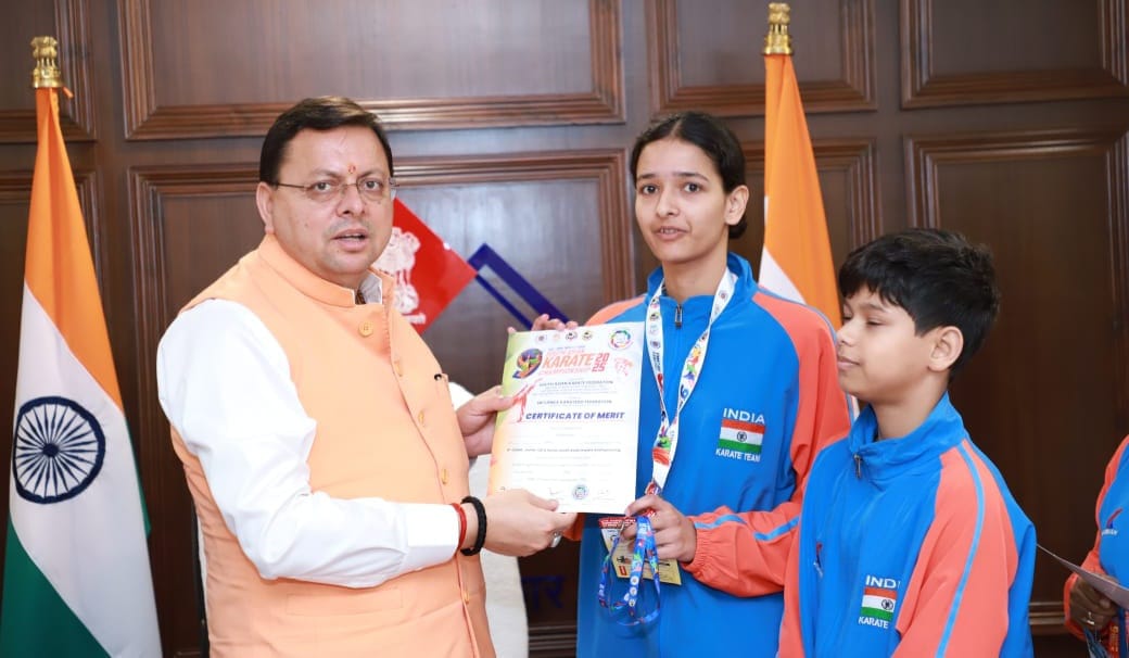 देहरादून – मुख्यमंत्री पुष्कर सिंह धामी ने मंगलवार को नई दिल्ली में राज्य के तीन होनहार कराटे चैंपियंस को सम्मानित किया। मुख्यमंत्री ने कहा कि सम्मानित किए जा रहे सभी प्रतिभाशाली खिलाड़ी राज्य के उज्ज्वल भविष्य की नींव हैं। उन्होंने कहा, इन खिलाडियों ने अपनी खेल प्रतिभा से अपने माता-पिता के साथ ही उत्तराखंड का मान भी बढ़ाया है। तीनों खिलाड़ियों अनामिका, मैत्री व क्रियांश ने 5-6 जुलाई 2025 को कोलंबो, श्रीलंका में आयोजित 9वीं साउथ एशियन कराटे चैंपियनशिप में भारत का प्रतिनिधित्व करते हुए रजत, कांस्य व कांस्य पदक जीते है, मुख्यमंत्री ने इन खिलाडियों के उज्जवल भविष्य की कामना की तथा भविष्य के आयोजनों में सफलता के लिये शुभकामनाये भी दी।