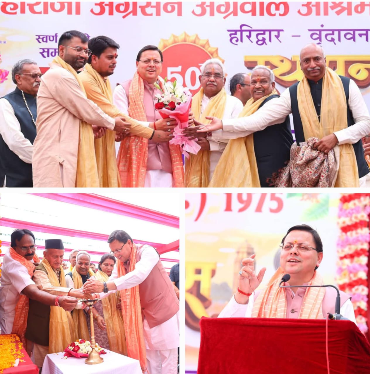 मुख्यमंत्री पुष्कर सिंह धामी ने सेवा एवं समर्पण के प्रतीक महाराजा अग्रसेन को नमन करते हुए सभी को महाराजा अग्रसेन अग्रवाल आश्रम ट्रस्ट के 50 वर्ष की गौरवपूर्ण यात्रा पूरी करने पर शुभकामनाएं दी। उन्होंने कहा अग्रवाल आश्रम ट्रस्ट द्वारा पिछले 50 वर्षों से समाज सेवा, धार्मिक जागरण, सांस्कृतिक संरक्षण, मानव कल्याण से जुड़े कार्यों को समर्पित भाव से किया जा रहा है। उन्होंने कहा जिस भवन का आज लोकार्पण हुआ उसके भव्य घाट आध्यात्मिक साधना का प्रमुख केंद्र बनेंगे एवं सामाजिक एकता को दर्शाएंगे।