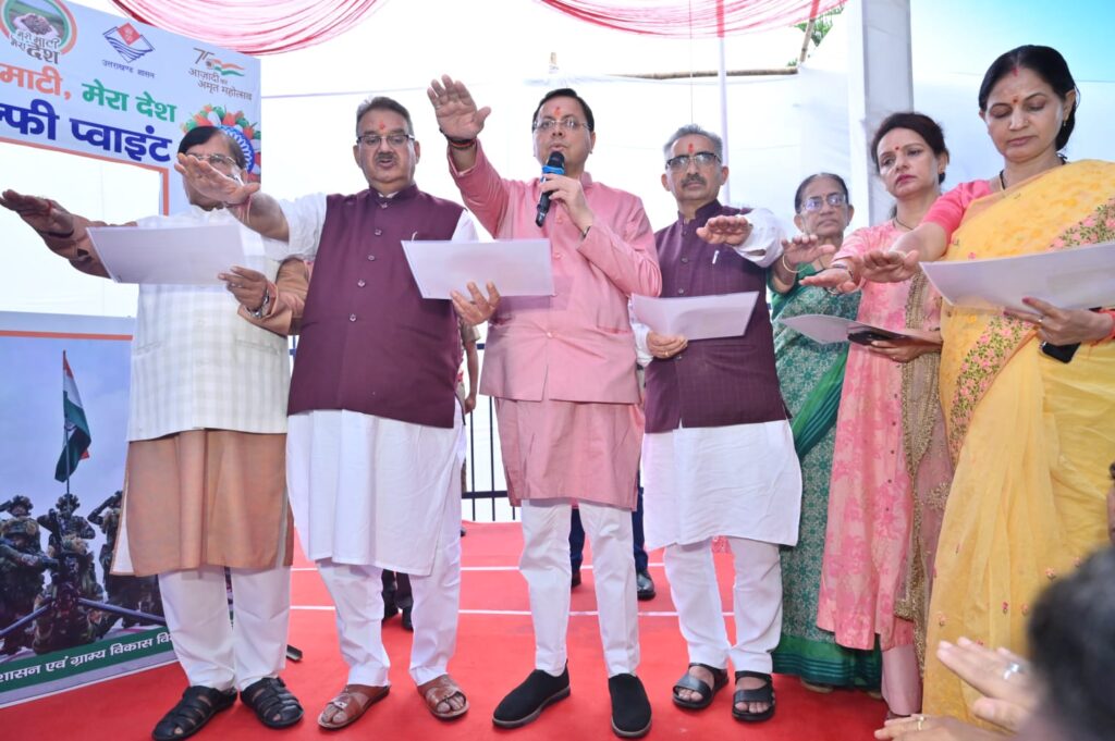 मुख्यमंत्री पुष्कर सिंह धामी ने अमर बलिदानियों की स्मृति में शिलापट का अनावरण किया। उन्होंने सभी को पंच प्रण की शपथ दिलाई एवं गुच्चू पानी में अमृत वाटिका के लिए वृक्षारोपण किया। इस अवसर पर पवित्र मिट्टी को हाथ में लेकर शपथ दिलाई गई एवं सेल्फी भी ली गई। मुख्यमंत्री ने सभी को अपनी सेल्फी merimaatimeradesh.Gov.in पर अपलोड करने की अपील की। कार्यक्रम में मुख्यमंत्री ने स्वतंत्रता संग्राम सेनानियों एवं शहीदों के परिजनों को सम्मानित भी किया।