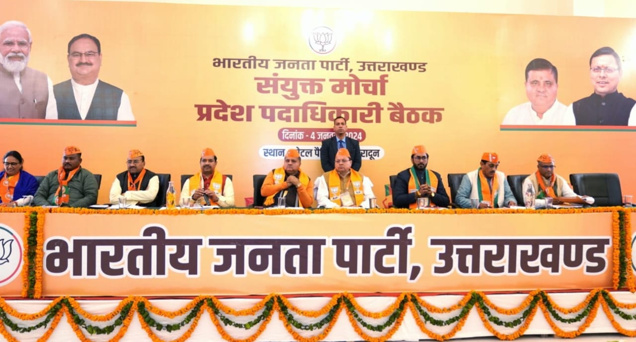 देहरादून – मुख्यमंत्री पुष्कर सिंह धामी ने गुरूवार को सुभाष रोड़ स्थित होटल में आयोजित भारतीय जनता पार्टी संयुक्त मोर्चा प्रदेश पदाधिकारी बैठक में प्रतिभाग किया। इस अवसर पर अपने संबोधन में मुख्यमंत्री ने कहा कि हमें समाज हित से जुड़े सभी विषयों के माध्यम से समाज के हर वर्ग और हर व्यक्ति तक जुड़ना होगा तथा प्रधानमंत्री नरेन्द्र मोदी की भांति देश और अपने संगठन को और अधिक मजबूत करने के लिए दिन-रात काम करना होगा।