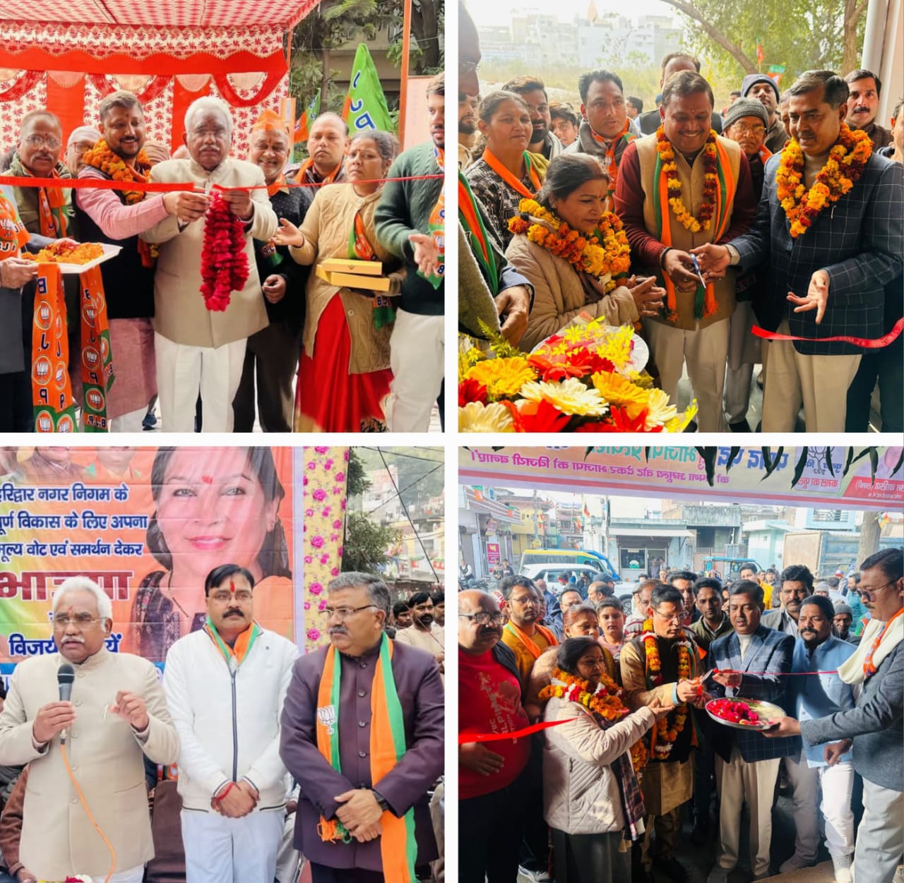 हरिद्वार – भाजपा ने नगर निगम चुनाव के कार्यालय उद्घाटन की श्रृंखला में आर्यनगर, तपोवन नगर, संदेशनगर आचार्यन गुरुकुल हनुमंतपुरम, जगजीतपुर गंगाधर महादेव नगर राजघाट कुम्हारघड़ा सीतापुर वाल्मीकि बस्ती विष्णुलोक आदि वार्डों में चुनावी कार्यालय का उद्घाटन किया। जिसमे मेयर प्रत्याशी किरण जैसल, विधायक मदन कौशिक विधायक, आदेश चौहान, जिलाअध्यक्ष संदीप गोयल, पूर्व मेयर मनोज गर्ग, विकास तिवारी, आशुतोष शर्मा, आशु चौधरी लव शर्मा ने शुभारंभ किया।