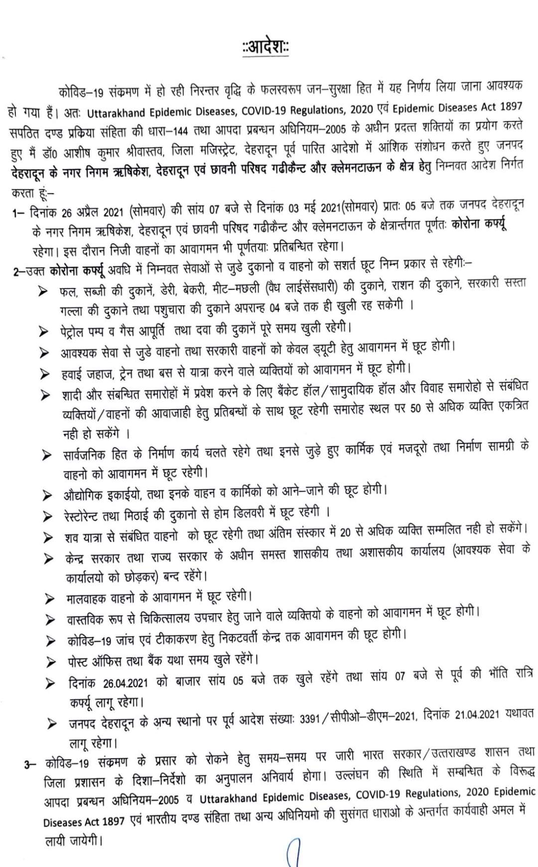 देहरादून – देहरादून जिला अधिकारी ने नगर निगम ऋषिकेश, देहरादून एवम छावनी परिषद गढ़ीकैंट और क्लेमेनटाउन में रहेगा कोरोना कर्फ़्यू रखने की घोषणा की है। जिलाधिकारी आशीष श्रीवास्तव ने यह आदेश जारी किया है। राजधानी देहरादून में लगातार कोरोना का संक्रमण बढ़ रहा है। बढ़ते संक्रमण को देखते हुए आदेश जारी किया गया।