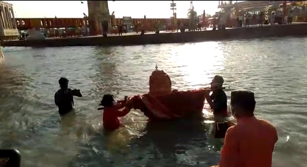 हरिद्वार – कुंभ मेले में स्नान करने के लिए देवभूमि उत्तराखंड के तीन देव स्थानों से देव डोलियां हरिद्वार पहुंची। रविवार सुबह तीनो देव डोलियों को हरकी पैड़ी पर गंगा स्नान कराया गया। कुंभ मेला प्रतीकात्मक होने और कोरोना के बढ़ते प्रकोप के कारण सिर्फ तीन देव डोलिया ही स्नान के लिए हरिद्वार पहुंची हैं। देवभूमि संस्कृति विरासत शोभायात्रा समिति के अध्यक्ष मोहन सिंह रावत गांव वासी ने बताया कि देव डोलियों का स्नान कार्यक्रम भी प्रतीकात्मक किया जा रहा है। पूर्व निर्धारित कार्यक्रम के अनुसार हजारों लोगों को देव डोलियों के स्नान में पहुंचना था लेकिन प्रधानमंत्री नरेंद्र मोदी के आह्वान के बाद अब सिर्फ तीन देव डोलियां ही स्नान के लिए आई हैं।