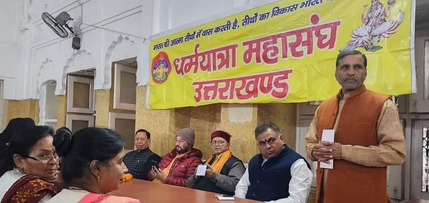 धर्म यात्रा महासंघ के प्रांतीय संरक्षक रविंद्र गोयल, प्रांतीय महामंत्री डॉ. चंद्रधर काला, प्रांतीय कोषाध्यक्ष डॉ. उपेंद्र गुप्ता व विशिष्ट अतिथि विहिप के जिलाध्यक्ष एवं हर की पैड़ी प्रबंधकारिणी संस्था गंगा सभा के अध्यक्ष नितिन गौतम के सानिध्य में हरिद्वार तीर्थ पर यात्रियों की सुविधा के लिए प्रशासन के समक्ष विविध विषयों को उठाने का निर्णय लिया गया। बैठक का संचालन महासंघ के राष्ट्रीय मंत्री व धर्म प्रवाह के संपादक डॉ. रजनीकांत शुक्ल ने किया। महासंघ के संगठन मंत्री शिवनारायण द्वारा धर्मयात्रा महासंघ की स्थापना व उद्देश्य के साथ आगामी योजनाओं के सम्बंध में सभी को विस्तृत जानकारी दी गई।