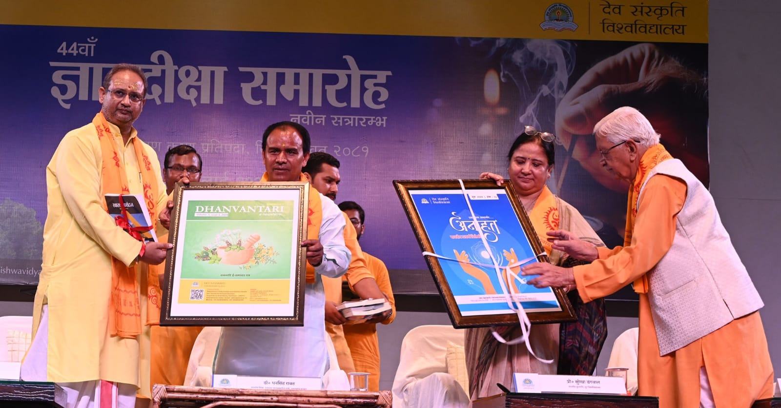 देवसंस्कृति विश्वविद्यालय शांतिकुंज के 44वाँ ज्ञानदीक्षा संस्कार समारोह में नवप्रवेशी विद्यार्थी वैदिक सूत्रों में बंधे। समारोह में उत्तराखंड, छत्तीसगढ़, मप्र, झारखण्ड, बिहार सहित 22 राज्यों के 2000 से अधिक छात्र-छात्राएँ उपस्थित रहे। श्री उदयकिशोर मिश्र व श्री रामावतार पाटीदार ने नवप्रवेशार्थी छात्र-छात्राओं को वैदिक रीति से ज्ञानदीक्षा का वैदिक कर्मकाण्ड कराया। वहीं चयनित विद्यार्थियों को अतिथियों ने देसंविवि के प्रतीक चिह्न भेंट किया। समापन से पूर्व मुख्य अतिथि, विशिष्ट अतिथि, कुलपति एवं प्रतिकुलपति ने धन्वन्तरी सहित अनेक पत्रिकाओं का विमोचन किया।