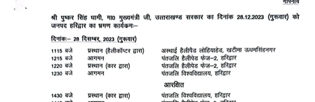वहीं मुख्यमंत्री पुष्कर सिंह धामी भी आज हरिद्वार भ्रमण पर रहेंगे। पुष्कर सिंह धामी अस्थाई हेलीपैड खटीमा से 11.15 मिनट पर हरिद्वार के लिए निकलेंगे और 12.15 बजे पतंजलि हेलीपैड फेज 2 पहुंचेंगे, जहां से वह 12.30 पतंजलि विश्वविद्यालय के कार्यक्रम में शामिल होंगे।