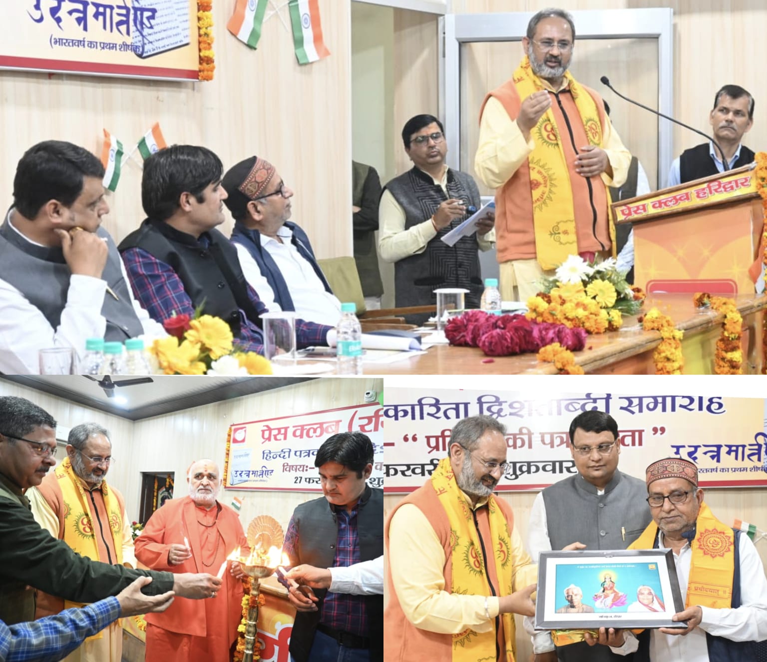 हरिद्वार – हिंदी पत्रकारिता के दौ सौ वर्ष पूरे होने के उपलक्ष्य में प्रैस क्लब में आयोजित किया जा रहे हिंदी पत्रकारिता दिशताब्दी समारोह के तहत शुक्रवार को प्रैस क्लब सभागार में व्याख्यान माला का आयोजन किया गया। कार्यक्रम का शुभारंभ मुख्य अतिथी देव संस्कृति विवि के प्रतिकुलपति डा. चिन्मय पंडया, मुख्य वक्ता नेशनल यूनियन ऑफ जर्नलिस्ट इंडिया के राष्ट्रीय महासचिव प्रदीप कुमार तिवारी, निरंजनी अखाड़े के सचिव श्रीमहंत रामरतन गिरी, प्रेस क्लब अध्यक्ष धर्मेंद्र चौधरी एवं महामंत्री दीपक मिश्रा ने दीप प्रज्वलित कर किया। वरिष्ठ पत्रकार कौशल सिखोला, रजनीकांत शुक्ला, संजय आर्य, संदीप रावत ने स्मृति चिन्ह, रूद्राक्ष की माला एवं गंगाजली भेंटकर अतिथीयों का स्वागत किया।