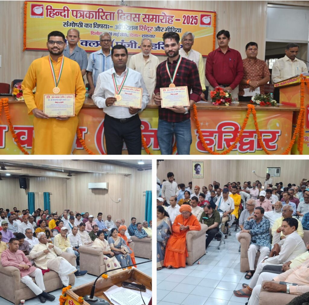 समारोह की अध्यक्षता कर रहे जूना पीठाधीश्वर आचार्य महामंडलेश्वर स्वामी अवधेशानंद गिरी ने कहा कि ऑपरेशन सिंदूर के दौरान सिंदूर का एक नया रूप शौर्य, पराक्रम, पुरुषार्थ और प्रचंडता के रूप में दुनिया के सामने आया है और संयम, संस्कृत साहसी भारत का प्रतीक बना। उन्होंने कहा कि ऑपरेशन सिंदूर में चार दिन में ही पाकिस्तान ने घुटने टेक दिए जो देश की सेना के अदम्य साहस और देश के नेतृत्व की प्रखरता और प्रतिबद्धता को दिखाता है। उन्होंने कहा कि इन चार दिनों में देश की एकता, अखंडता और वैचारिक समानता दिखाई दी। उन्होंने देशवासियों से कहा कि जल्द ही पीओके भारत का हिस्सा होगा। उन्होंने पाकिस्तान की परमाणु बम की गीदड़ भभकी पर चुटकी लेते हुए कहा कि ऑपरेशन सिंदूर से दुनिया के सामने आ गई कि जिन परमाणु बमों की पाक धमकी देता है वह तो उसके है ही नहीं और उनका नियंत्रण तो विदेशी ताकतों के हाथों में है। हिंदी पत्रकारिता दिवस समारोह में हरिद्वार के तीन विश्वविद्यालयों, संस्कृत विश्वविद्यालय, देव संस्कृति विश्वविद्यालय और गुरुकुल कांगड़ी विश्वविद्यालय के हिंदी पत्रकारिता संकाय के टॉपर छात्रों को स्वर्ण पदक प्रदान किया गया।