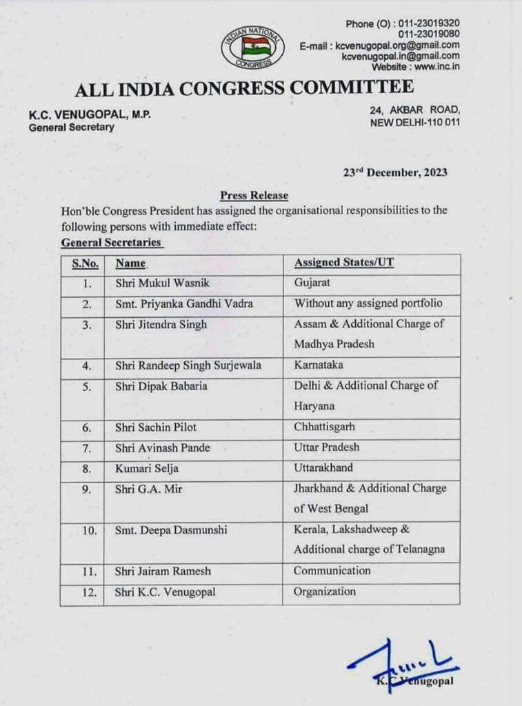 पार्टी के वरिष्ठ महासचिव मुकुल वासनिक को गुजरात, जितेंद्र सिंह को असम के साथ मध्य प्रदेश का अतिरिक्त प्रभार, रणदीप सुरजेवाला को कर्नाटक, कुमारी सैलजा उत्तराखंड, दीपा दासमुंशी केरल, लक्षद्वीप के साथ तेलंगाना का अतिरिक्त प्रभार, गुलाम अहमद मीर को झारखंड और बंगाल का अतिरिक्त जिम्मा सौंपा गया है। दीपक बाबरिया को दिल्ली और हरियाणा की जिम्मेदारी भी उनके पास है।