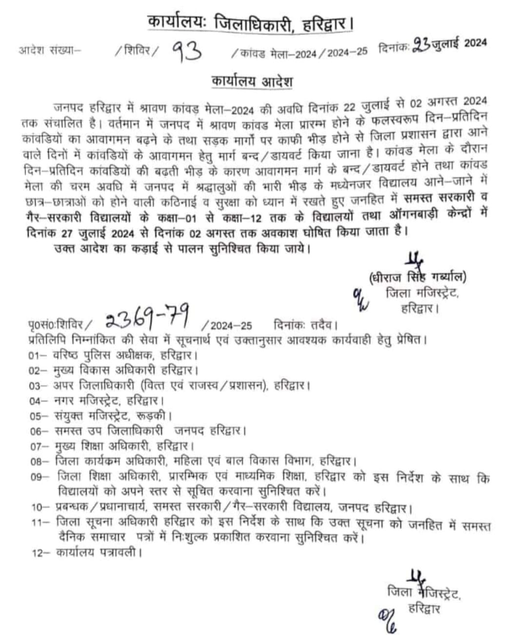 जिलाधिकारी धीराज सिंह गर्ब्याल ने आदेश में कहा कि कांवड मेला प्रारम्भ होने से जनपद में दिन-प्रतिदिन कांवडियों का आवागमन बढ़ने के तथा सड़क मार्गों पर काफी भीड़ होने से जिला प्रशासन द्वारा आने वाले दिनों में कांवडियों के आवागमन हेतु मार्ग बन्द / डायवर्ट किया जाना है। कांवड मेला के दौरान दिन-प्रतिदिन कांवडियों की बढ़ती भीड़ के कारण आवागमन मार्ग के बन्द / डायवर्ट होने तथा कांवड मेला की चरम अवधि में जनपद में श्रद्धालुओं की भारी भीड़ के मध्येनजर विद्यालय आने-जाने में छात्र-छात्राओं को होने वाली कठिनाई व सुरक्षा को ध्यान में रखते हुए जनहित में समस्त सरकारी व गैर-सरकारी विद्यालयों के कक्षा 01 से कक्षा 12 तक के विद्यालयों तथा आँगनबाड़ी केन्द्रों में 27 जुलाई से दिनांक 02 अगस्त तक अवकाश घोषित किया जाता है।
