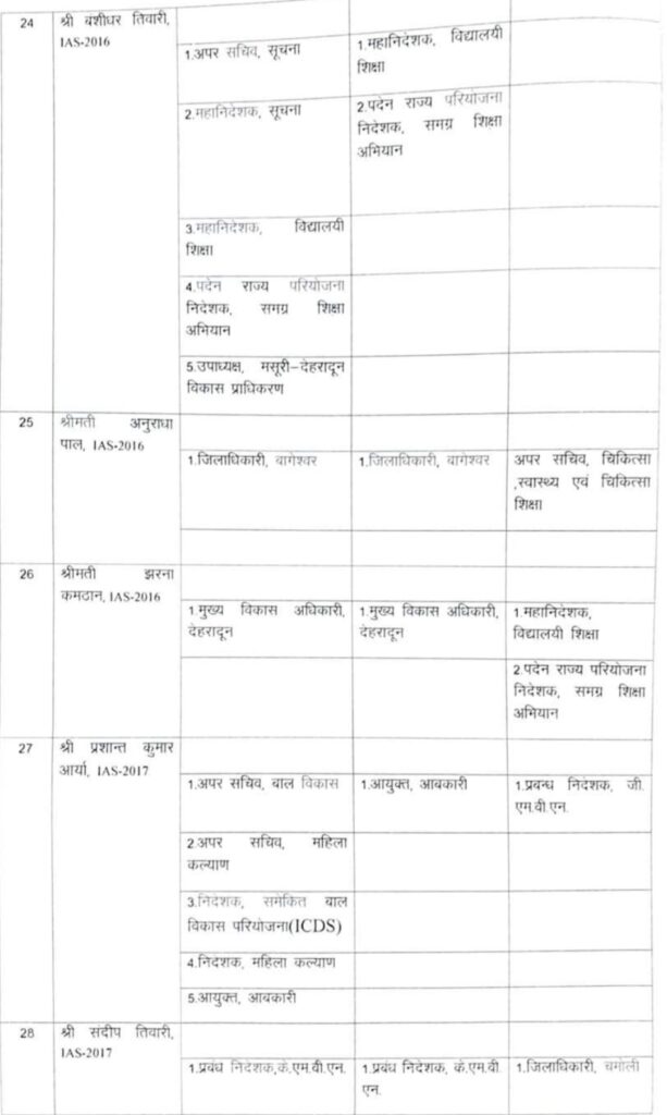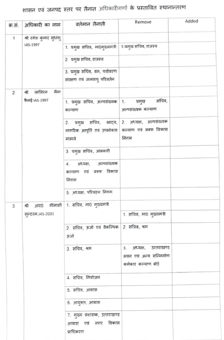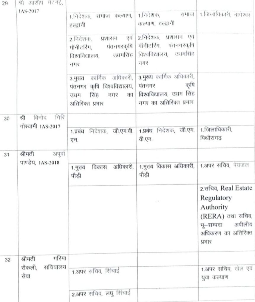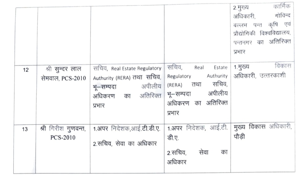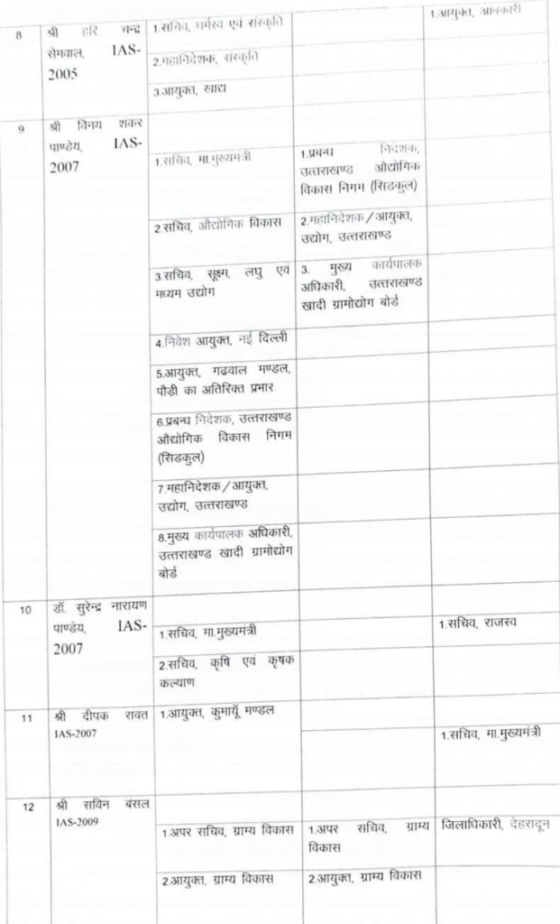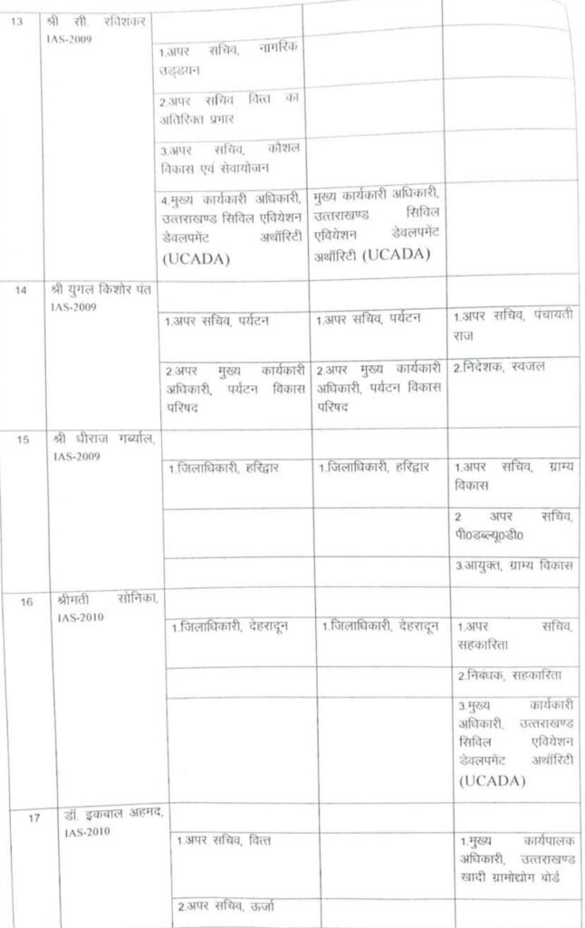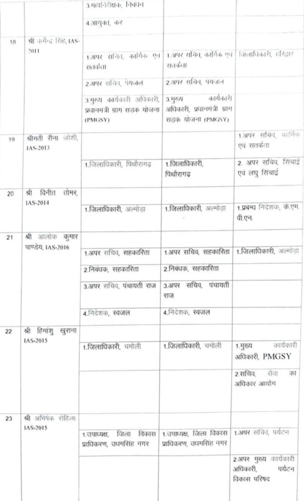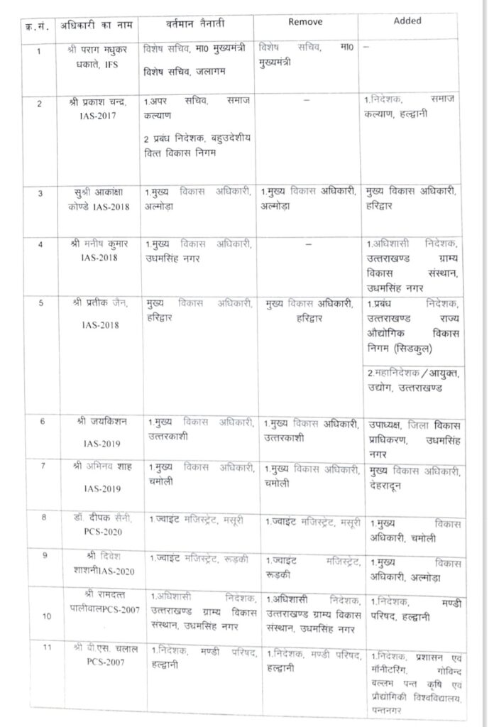 देहरादून – उत्तराखंड में बड़ी संख्या में आईएएस अधिकारियों के तबादले किए गए हैं। हरिद्वार, चमोली, बागेश्वर और पिथौरागढ़ समेत कई जिलों के जिलाधिकारियों समेत अन्य कई अधिकारियों के भी तबादले किए गए। वहीं शासन स्तर पर भी कई आईएएस अधिकारियों के कार्यक्षेत्र में परिवर्तन भी किया गया है देखिए पूरी लिस्ट