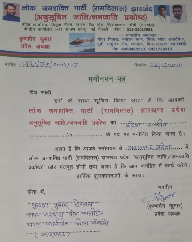 वहीं लोक जनशक्ति पार्टी अनुसूचित जाति/जनजाति प्रकोष्ठ प्रदेश अध्यक्ष कृष्णदेव कुमार ने कृष्णा कुमार हेंब्रम को लोक जनशक्ति पार्टी अनुसूचित जाति/जनजाति प्रकोष्ठ का प्रदेश सचिव नियुक्त किया है।