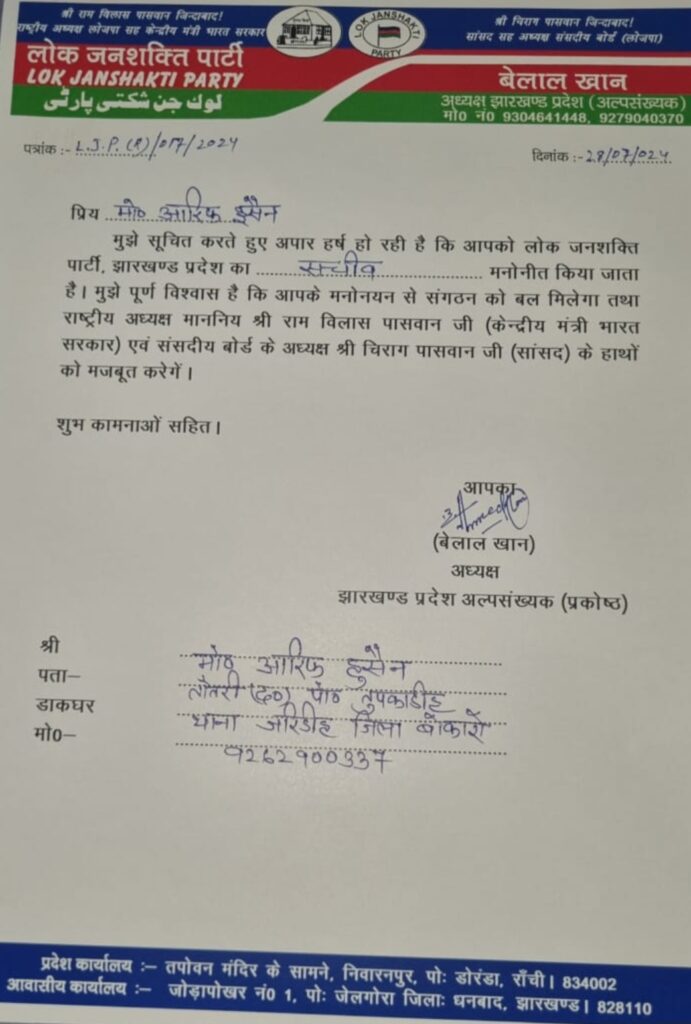 बोकारो (झारखंड) – लोक जनशक्ति पार्टी अल्पसंख्यक प्रकोष्ठ के झारखंड प्रदेशाध्यक्ष बेलाल खान ने मो0 आरिफ हुसैन को लोक जनशक्ति पार्टी अल्पसंख्यक प्रकोष्ठ के प्रदेश सचिव के पद पर मनोनीत किया है।