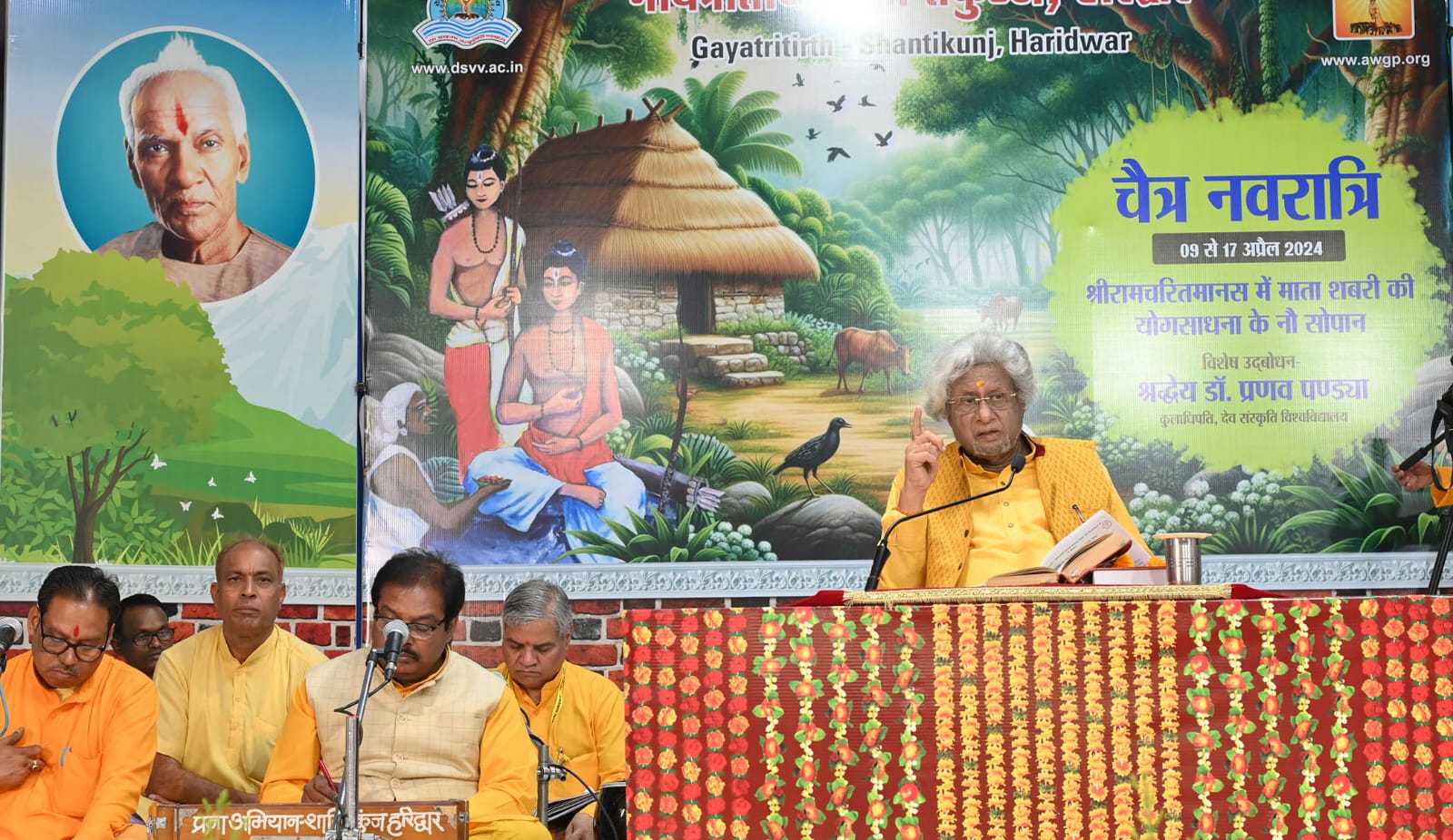 प्रसिद्ध आध्यात्मिक चिंतक श्रद्धेय डॉ. पण्ड्या शांतिकुंज के मुख्य सभागार में श्रीरामचरित मानस में माता शबरी की योग साधना विषय पर आयोजित सभा को संबोधित कर रहे थे। इस अवसर पर शांतिकुंज कार्यकर्ता भाई बहिन सहित देश विदेश से आये हजारों गायत्री साधक उपस्थित रहे।