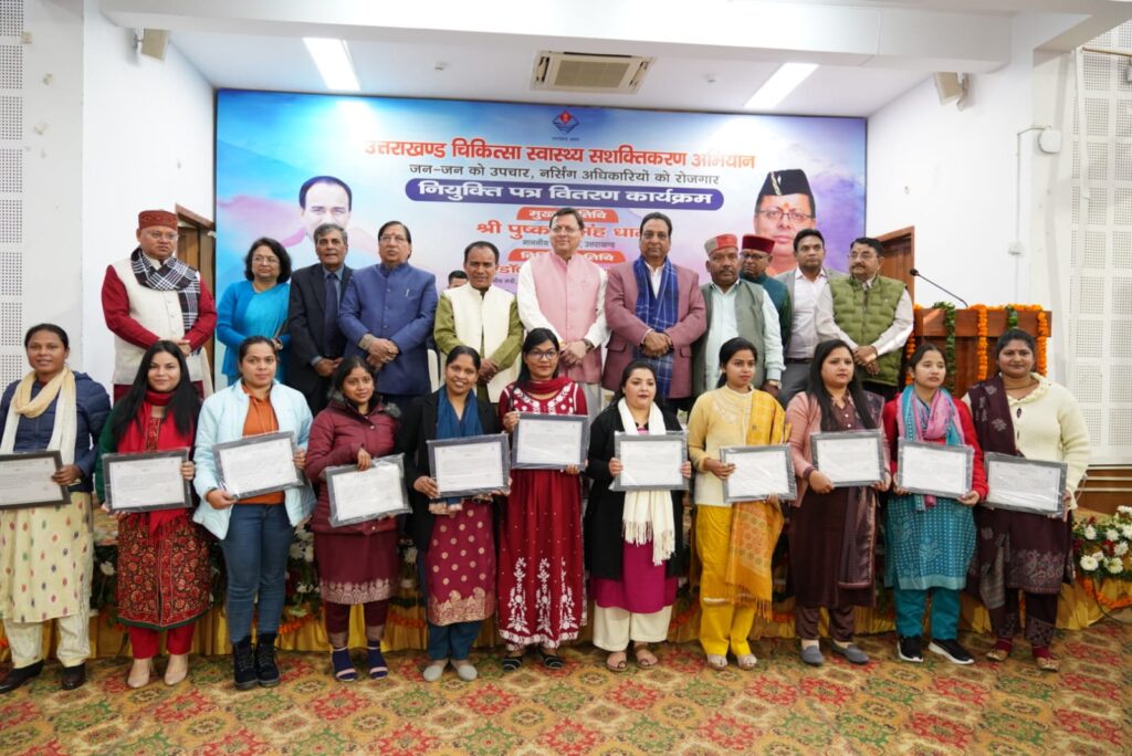 देहरादून – मुख्यमंत्री पुष्कर सिंह धामी ने रविवार को मुख्यमंत्री आवास स्थित, मुख्य सेवक सदन में उत्तराखण्ड चिकित्सा सेवा चयन बोर्ड द्वारा चयनित नर्सिंग अधिकारियों को नियुक्ति पत्र प्रदान किये। कार्यक्रम के दौरान चयनित 1376 अभ्यर्थियों में से 200 अभ्यर्थियों को मुख्यमंत्री द्वारा नियुक्ति पत्र प्रदान किये। शेष सभी अभ्यर्थियों को स्वास्थ्य विभाग द्वारा नियुक्ति पत्र प्रदान किये गये हैं।