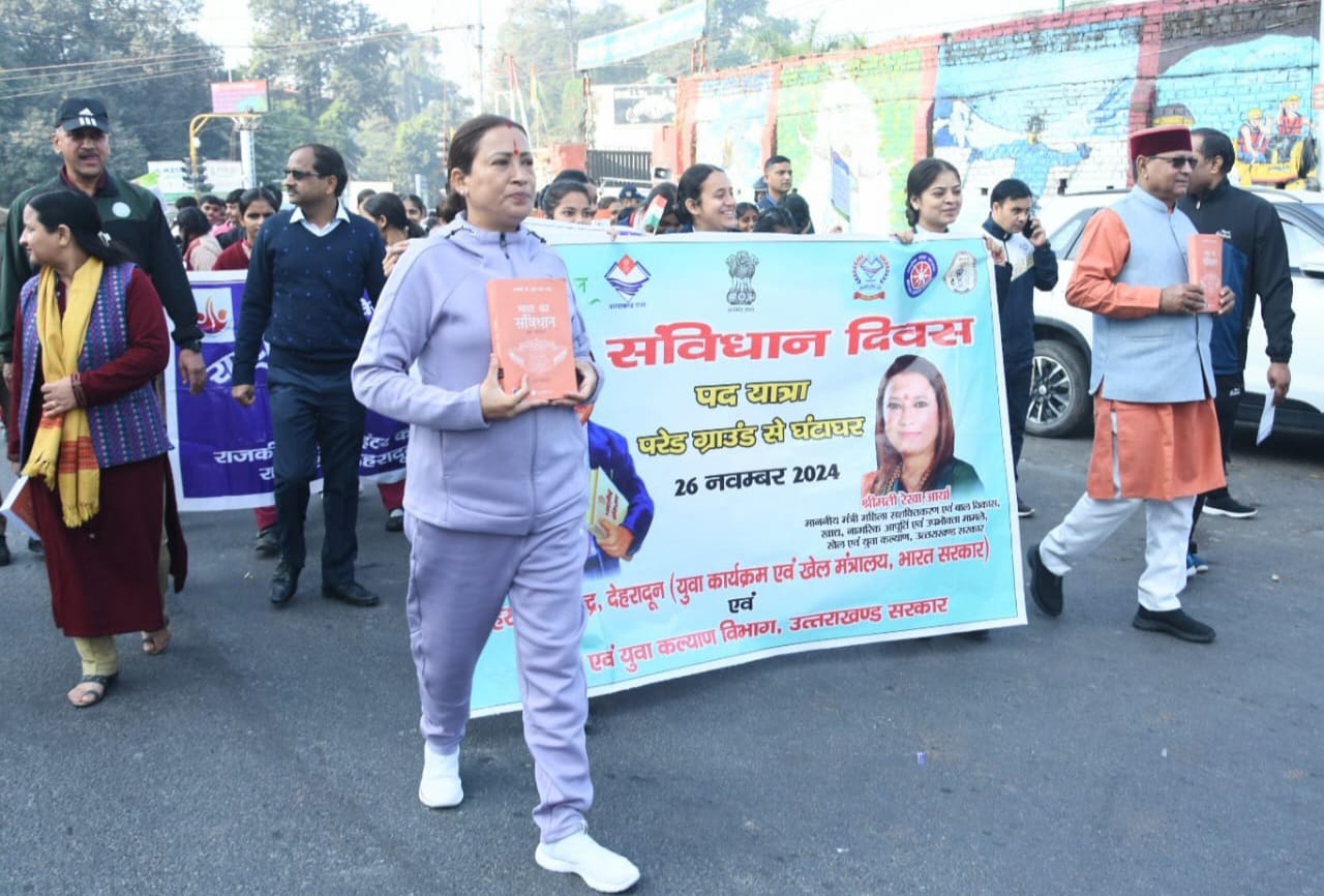 देहरादून – उत्तराखण्ड सरकार में कैबिनेट मंत्री रेखा आर्या ने देहरादून के पवेलियन ग्राउंड से संविधान दिवस के अन्तर्गत पद यात्रा की। संविधान दिवस के अवसर पर पद यात्रा देहरादून के पवेलियन ग्राउंड से प्रारंभ होकर घंटा घर स्थित बाबा साहब भीम राव अंबेडकर पार्क पहुँची जहाँ मंत्री रेखा आर्या ने बाबा साहब की मूर्ति पर माल्यार्पण कर उनको श्रद्धांजलि अर्पित की।