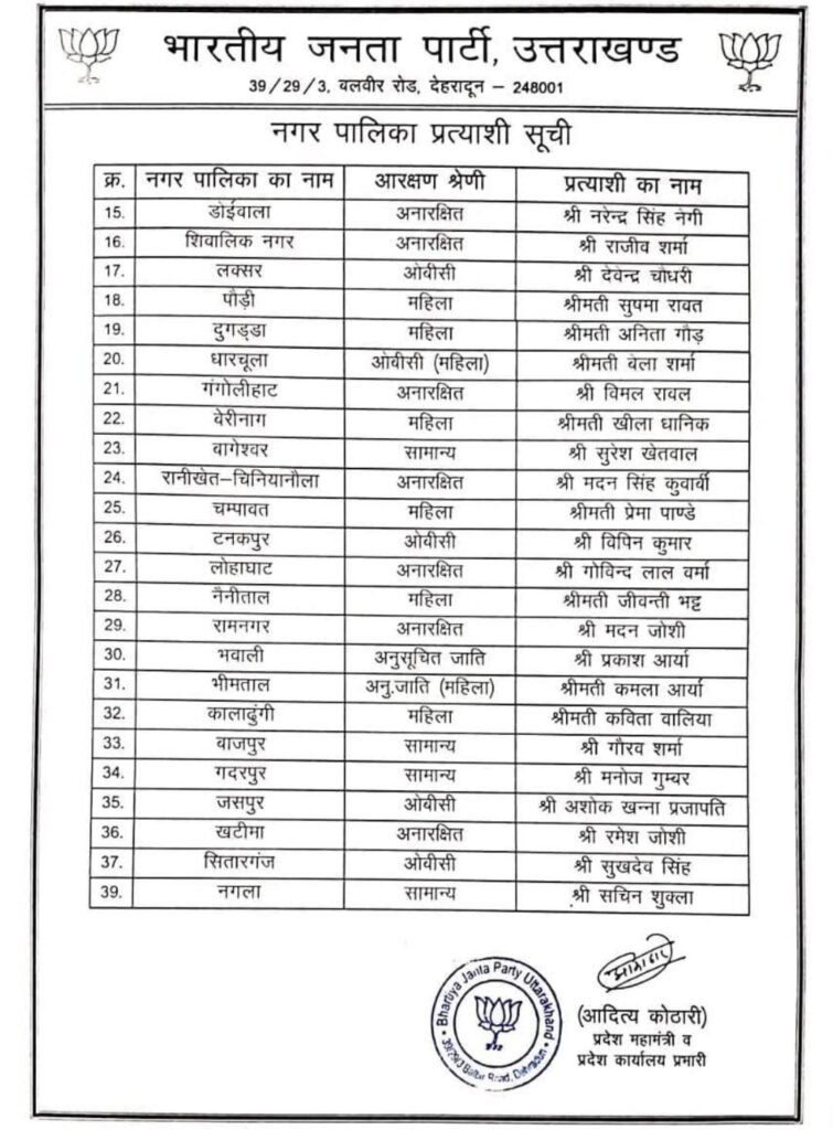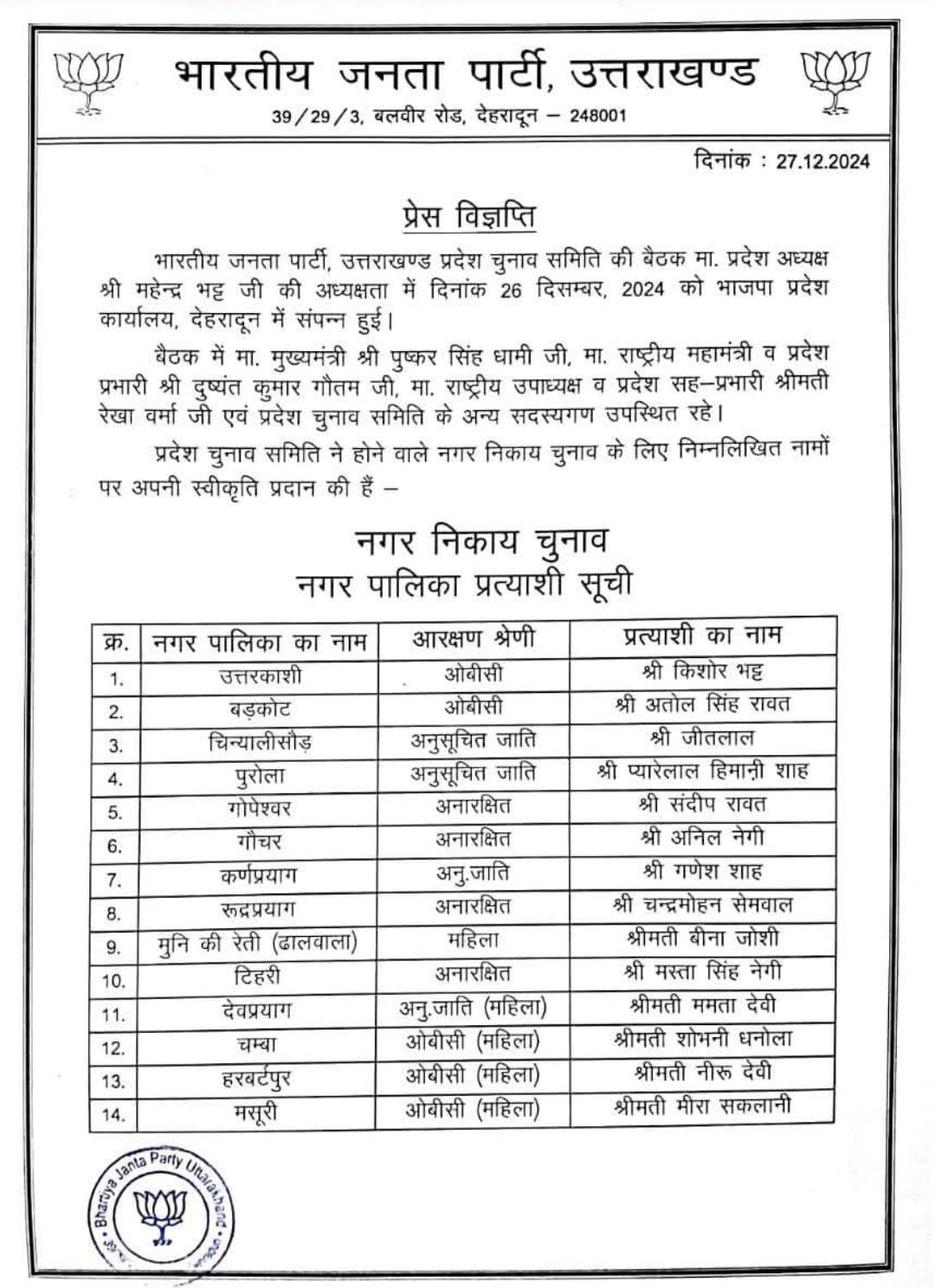 देहरादून – बीजेपी ने नगर निकाय चुनाव के प्रत्याशियों की लिस्ट जारी की है, हालांकि मेयर उम्मीदवारों के नाम का अभी भी इंतजार है। देखिए पूरी लिस्ट