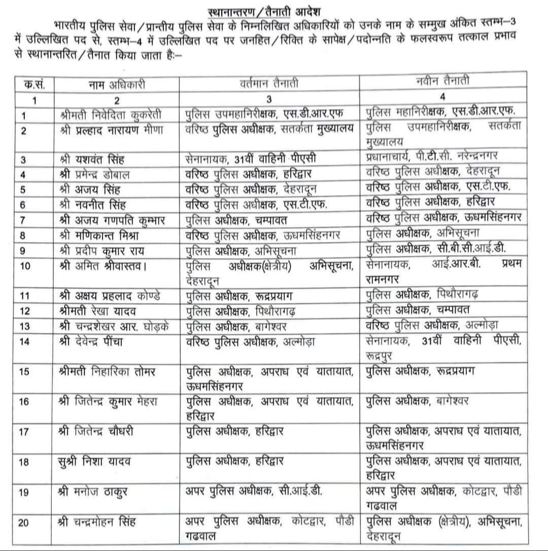 हरिद्वार – उत्तराखंड में बड़ी संख्या में पुलिस अधिकारियों के तबादले किए गए हैं। हरिद्वार, देहरादून, उद्यमसिंह नगर समेत कई जिलों में फेरबदल किया गया है।