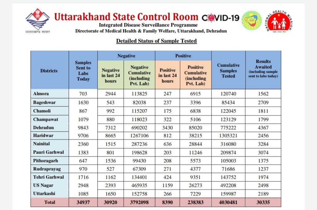 देहरादून – उत्तराखंड में कोरोना वायरस का संक्रमण तेज़ी से फैल रहा है। प्रदेश में संक्रमण जिस तेज़ी से फैल रहा है वह चिंतित करने वाला है। कोरोना कर्फ्यू और सख्त आदेश के बावजूद दिनप्रतिदिन बढ़ते आंकड़े सरकार और स्थानीय प्रशासन की चिंताएं बढ़ा रही हैं। प्रदेश के तमाम जिलों की स्थिति इस प्रकार है।