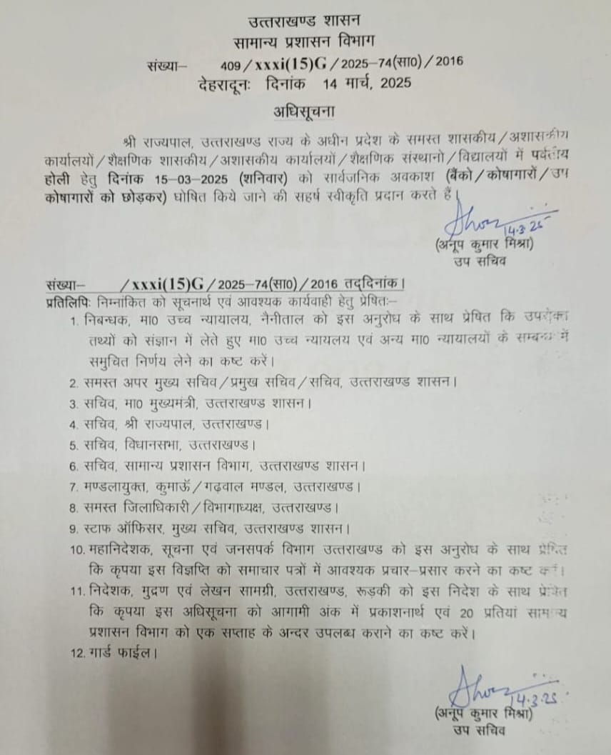 देहरादून – उत्तराखंड सरकार द्वारा प्रदेशवासियों के हित में एक महत्वपूर्ण निर्णय लिया गया है। मुख्यमंत्री पुष्कर सिंह धामी के निर्देशानुसार उत्तराखण्ड राज्य के अधीन समस्त शासकीय/अशासकीय कार्यालयों, शैक्षणिक संस्थानों/विद्यालयों में दिनांक 15 मार्च 2025 (शनिवार) को पर्वतीय होली के अवसर पर सार्वजनिक अवकाश घोषित किया गया है।