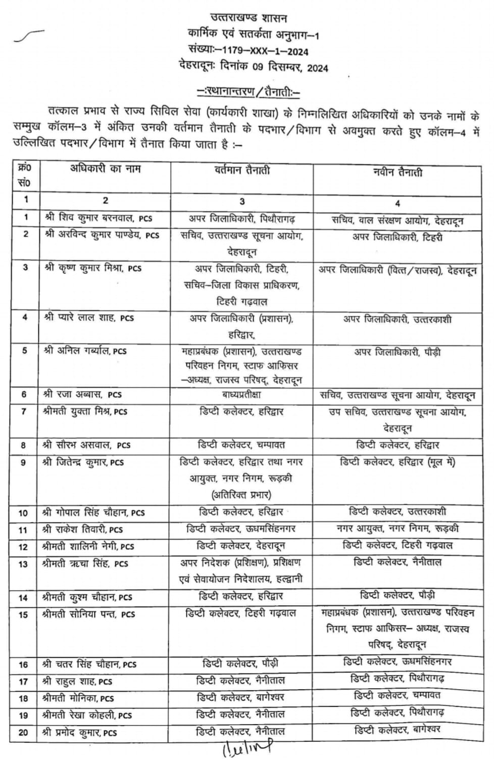 देहरादून – उत्तराखंड में कई पीसीएस अधिकारियों के तबादले हुए हैं, हरिद्वार की डिप्टी कलेक्टर कुशम चौहान को पौड़ी डिप्टी कलेक्टर बनाया गया है। जबकि अपर जिला अधिकारी टिहरी कृष्ण कुमार मिश्रा को अपर जिला अधिकारी देहरादून बनाया गया है। देखिए पूरी लिस्ट