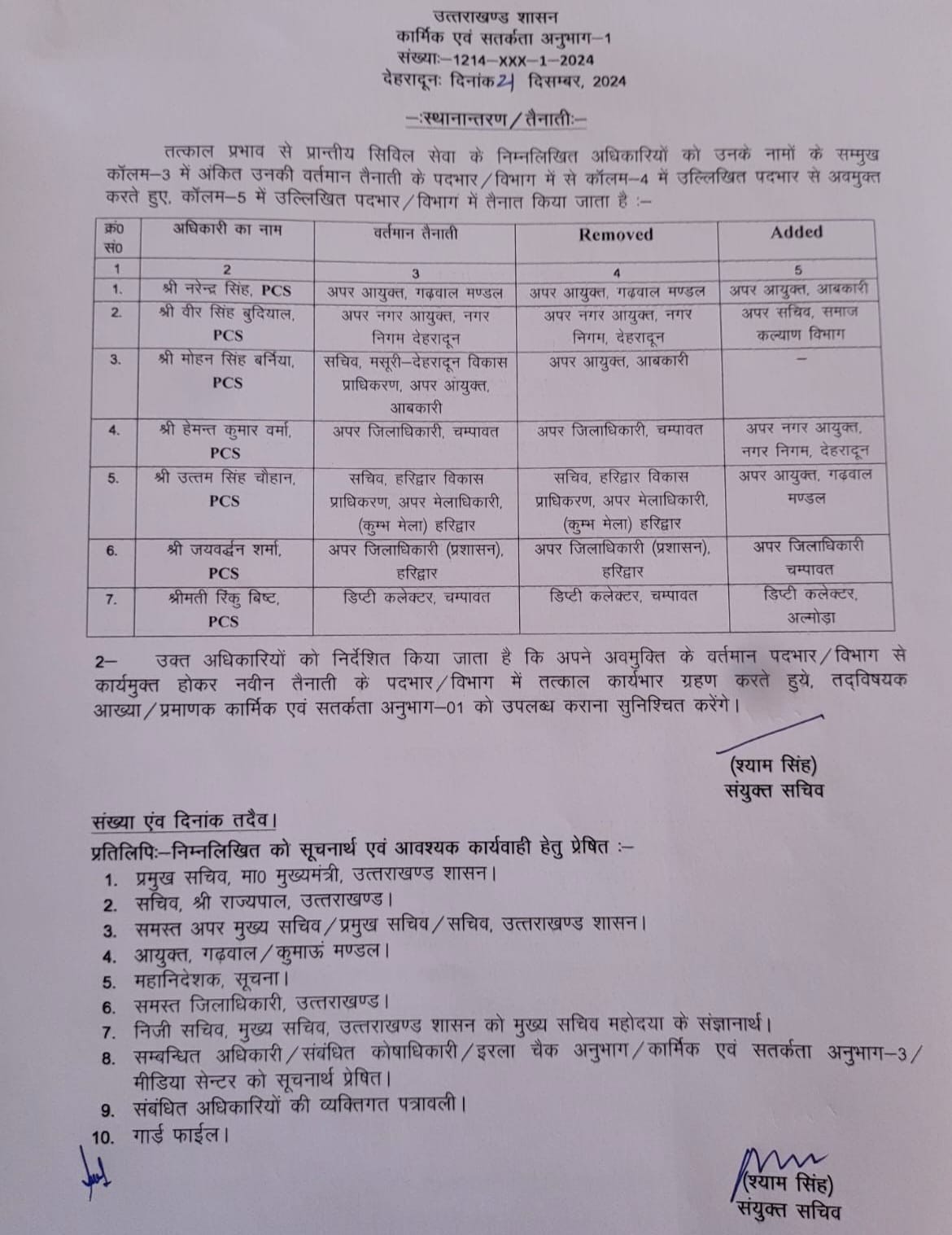 देहरादून – उत्तराखंड में 5 पीसीएस अधिकारियों के तबादला किए गए हैं। वीर सिंह बुध्दियाल को अपर सचिव समाज कल्याण विभाग बनाया गया। रिंकु बिष्ट को डिप्टी कलेक्टर अल्मोड़ा बनाया गया है। उत्तम सिंह चौहान को अपर आयुक्त गढ़वाल मंडल बनाया गया है।