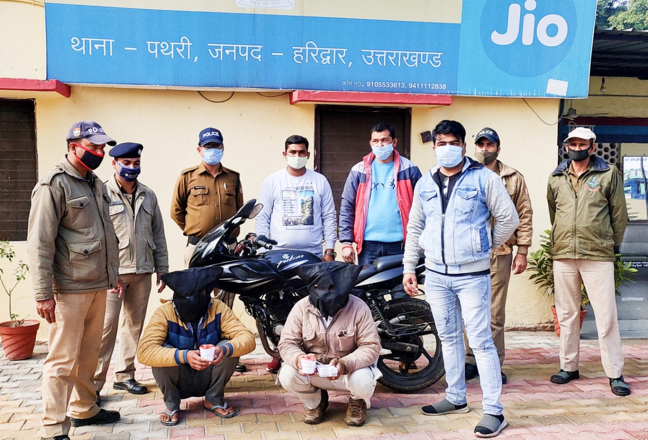 गौरतलब है कि हरिद्वार एसएसपी के आदेश पर पूरे जिले में अवैध नशे के खिलाफ बड़ा अभियान चला गया जा रहा है। इसी अभियान के तहत पथरी थाना पुलिस ने मुखबिर की सूचना पर दो स्मैक तस्करों को गिरफ्तार किया है। पथरी थाने में मामले का खुलासा करते हुए लक्सर सीओ विवेक कुमार ने बताया कि शुक्रवार को पथरी थाना क्षेत्र के सुभाष गढ़ गांव की पुलिया के पास पुलिस चेकिंग कर रही थी, इसी बीच उन्होंने सामने से आ रही मोटरसाइकिल को रुकने का इशारा किया लेकिन पुलिस को देखते ही मोटरसाइकिल सवार दोनों आरोपियों ने मोटरसाइकिल को कच्चे रास्ते की तरफ दौड़ा दिया और भागने लगे। लेकिन पुलिसकर्मियों ने मुस्तैदी के साथ दोनों को गिरफ्तार कर लिया। तलाशी लेने पर दोनों के पास से 48 ग्राम स्मैक बरामद हुई है, जिसकी बाजार में कीमत लगभग सवा लाख रुपये है। पुलिस ने दोनों आरोपियों के खिलाफ संबंधित धाराओं में मुकदमा दर्ज कर जेल भेज दिया है।