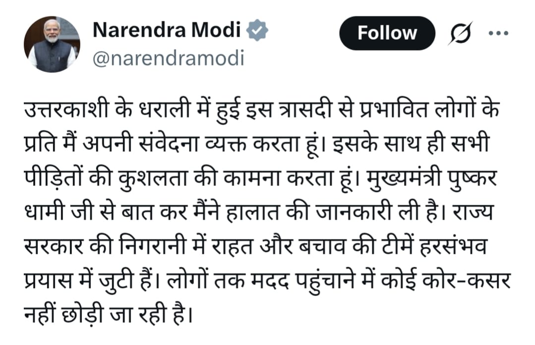 नई दिल्ली – उत्तरकाशी के धराली में हुए हादसे पर प्रधानमंत्री नरेंद्र मोदी ने गहरा दुख व्यक्त किया है। उन्होंने अपने सोशल मीडिया एकाउंट पर लिखा, उत्तरकाशी के धराली में हुई इस त्रासदी से प्रभावित लोगों के प्रति मैं अपनी संवेदना व्यक्त करता हूं। इसके साथ ही सभी पीड़ितों की कुशलता की कामना करता हूं। मुख्यमंत्री पुष्कर धामी जी से बात कर मैंने हालात की जानकारी ली है। राज्य सरकार की निगरानी में राहत और बचाव की टीमें हरसंभव प्रयास में जुटी हैं। लोगों तक मदद पहुंचाने में कोई कोर-कसर नहीं छोड़ी जा रही है।