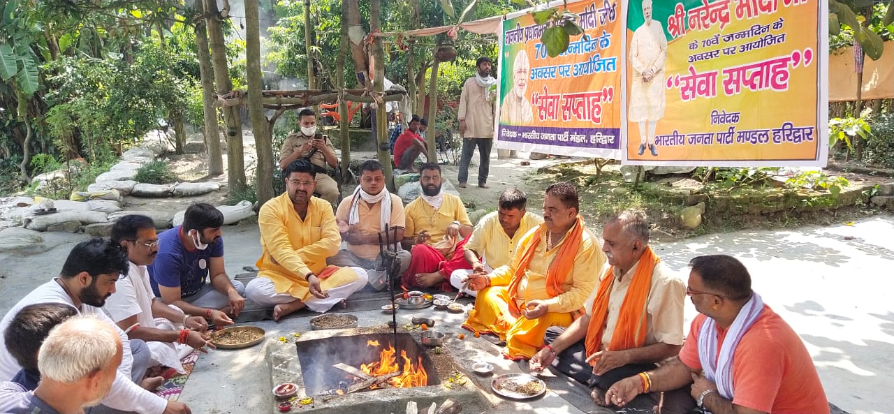 हरिद्वार – बीजेपी मंडल हरिद्वार ने देश के प्रधानमंत्री नरेंद्र मोदी के 70 वें जन्मदिन के अवसर पर उनकी दीर्घायु और स्वस्थ होने की कामना को लेकर भीमगोड़ा बैराज स्थित माँ गंगा तट पर हवन किया गया और उनके स्वस्थ रहने की कामना की गई इस वसर पर भाजपा के पूर्व जिलाध्यक्ष और राज्य जैविक उत्पाद परिषद के उपाध्यक्ष ठाकुर सुशील चौहान के नेतृत्व में आयोजित कार्यक्रम में पूजा अर्चना और हवन किया गया इस अवसर पर कार्यक्रम के मुख्य अतिथि उत्तराखंड सरकार के राज्य मंत्री ठाकुर सुशील चौहान ने कहा की आज मोदी जी का 70 वा जन्मदिन देश बहुत धूमधाम से मना रहा है आज मोदी जी की स्वीकार्यता ना केवल भारत में है अपितु पूरी दुनिया में है इसका कारण है इन 6 वर्षों में मोदी जी का देश की जनता को दिया गया सुशासन जो की पूर्णतः भ्रष्टाचार रहित रहा है आज मोदी जी देश ही नहीं अपितु पूरी दुनिया के सर्वमान्य नेता बनने की दिशा में आगे बढ़ रहे हैं अतः आज इस अवसर पर हम मां गंगा से यह प्रार्थना करते हैं कि मोदी जी शतायु हो और वे लगातार देश का नेतृत्व करते रहे!!!