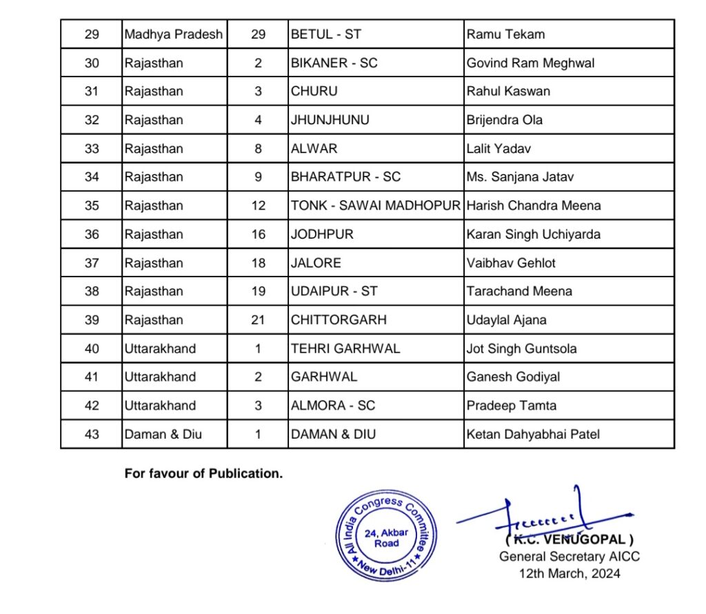 नई दिल्ली – लोकसभा चुनाव के मद्देनजर कांग्रेस ने अपनी दूसरी लिस्ट जारी कर दी है। पार्टी ने अल्मोड़ा से प्रदीप टम्टा को एक बार फिर अपना उम्मीदवार बनाया है तो पौड़ी से कांग्रेस के पूर्व प्रदेशाध्यक्ष गणेश गोदियाल को टिकट दी है।