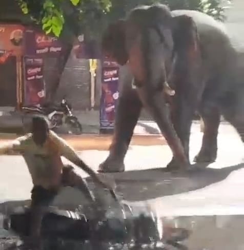 वीडियो में बाइक सवार के सामने से गुजरे दोनों हाथी, बाइक छोड़ कर भागता नजर आ रहा है युवक। क्षेत्र में देर रात अचानक दो हाथी आने से मची अफरा तफरी।
