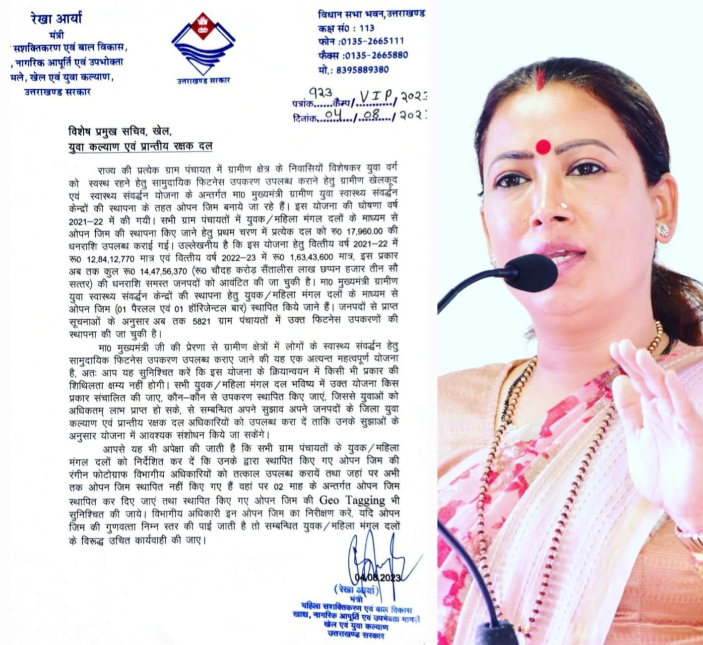 देहरादून – खेल एवं युवा कल्याण के समस्त विभागीय अधिकारी सभी ग्राम पंचायतों के युवक/महिला मंगल दलों के द्वारा स्थापित किए गए ओपन जिम की रंगीन फोटोग्राफ विभागीय अधिकारियों को जल्द ही उपलब्ध कराने के दिशा निर्देश विभागीय मंत्री रेखा आर्या ने दिए हैं। खेल मंत्री ने कहा कि मुख्यमंत्री पुष्कर सिंह धामी के कुशल नेतृत्व में हमारी सरकार व हमारा खेल विभाग खिलाड़ियों के हितों के लिये सदैव तत्पर है। इसी के दृष्टिगत हमने साल 2021-22 में सभी ग्राम पंचायतों में युवक/महिला मंगल दलों के माध्यम से ओपन जिम की स्थापना किए जाने हेतु प्रथम चरण में प्रत्येक दल को रु० 17,980.00 की धनराशि उपलब्ध कराई है।साथ ही अब तक कुल चौदह करोड़ सैंतालीस लाख छप्पन हजार तीन सौ सत्तर की धनराशि समस्त जनपदों को आवंटित की जा चुकी है।
